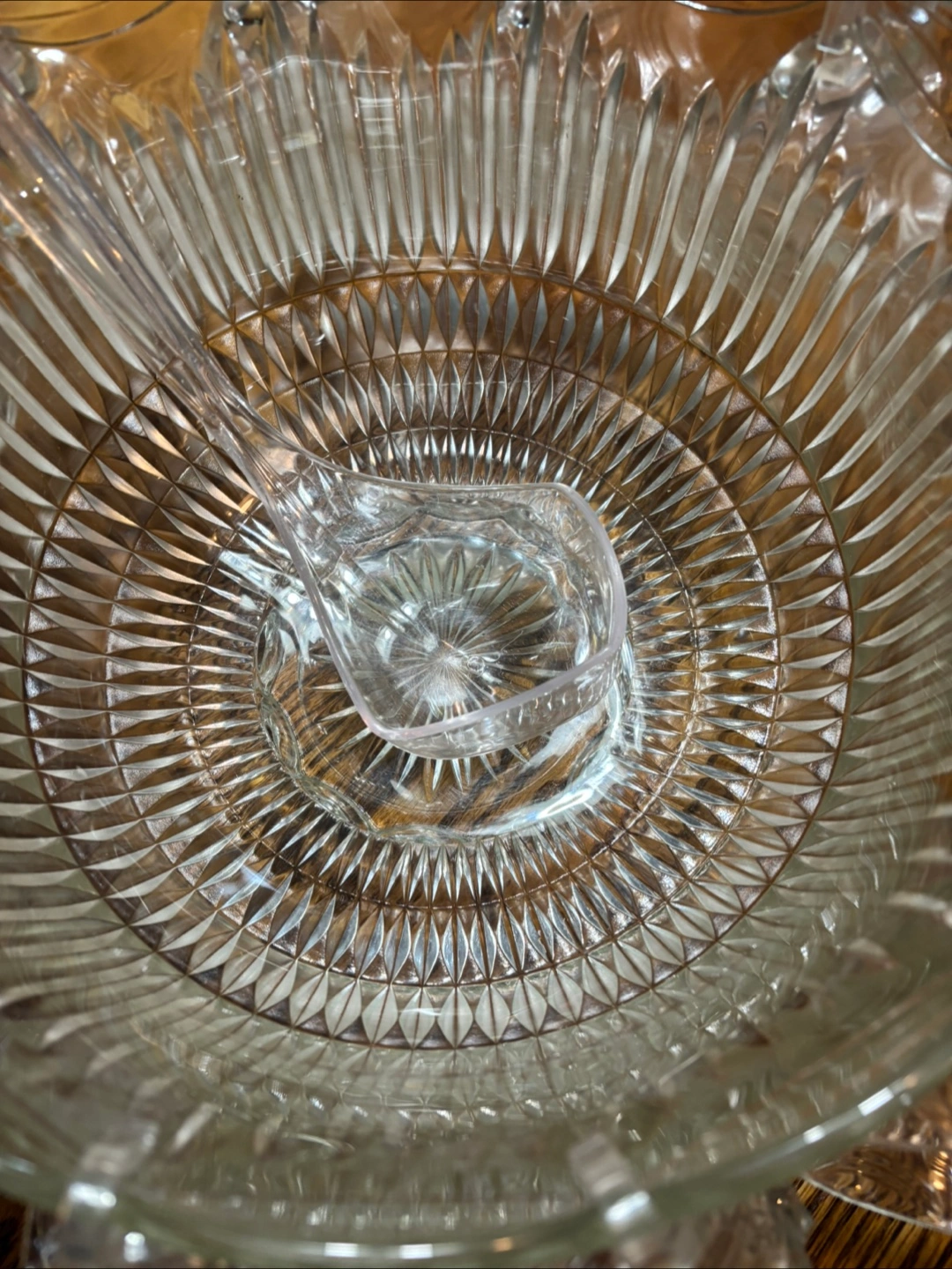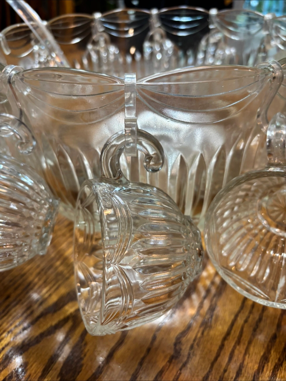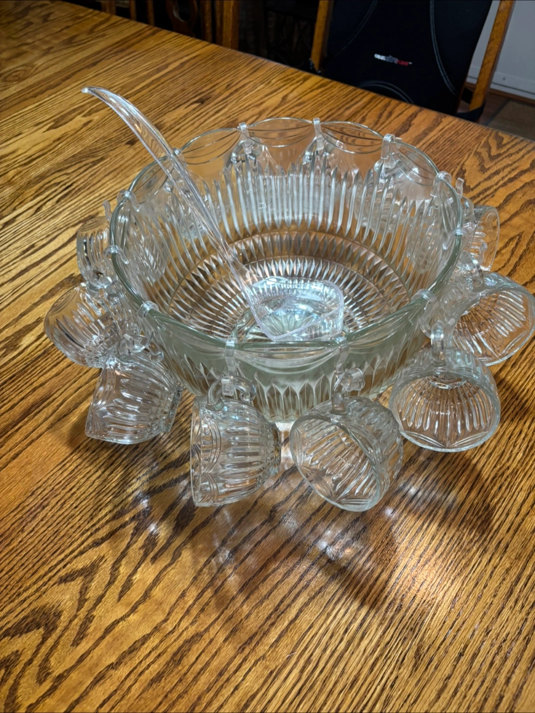 Selling a lovely complete vintage punch bowl set. It includes the large punch bowl, 12 matching cups, and a ladle. The set features a beautiful clear glass design with intricate patterns. Perfect for parties and gatherings!