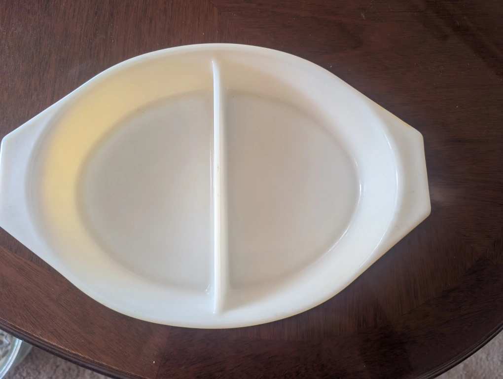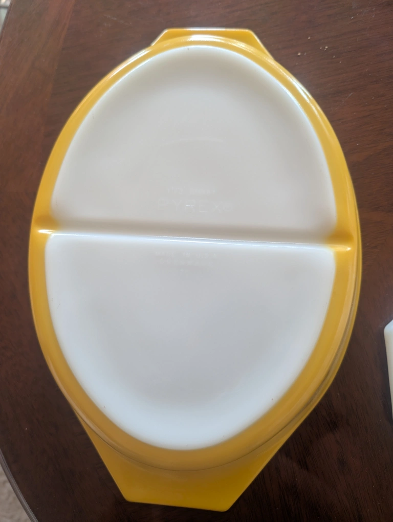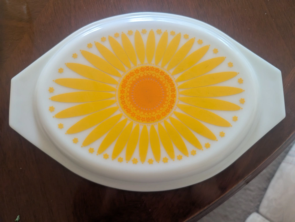 Selling a vintage Pyrex divided dish with a lovely sunflower pattern lid! It's in great condition and perfect for serving or display. The dish is a sunny yellow colour and the lid features a bright sunflower design. Great for collectors or anyone who loves vintage kitchenware!
