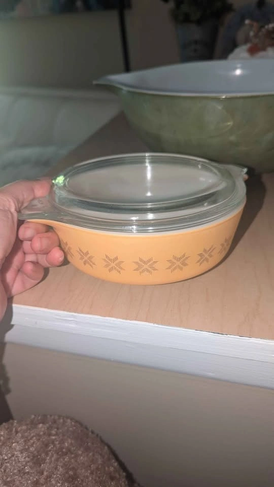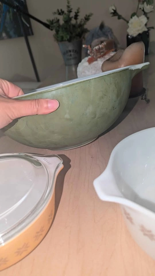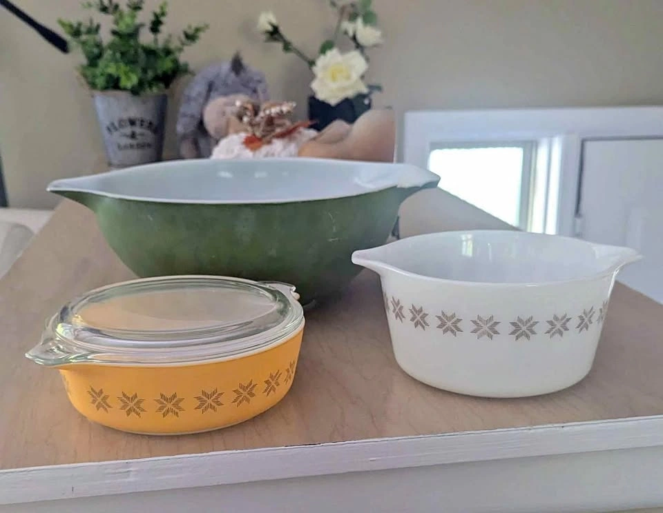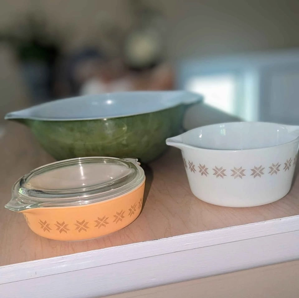 Vintage Pyrex dishes, Town & Country, orange has lid, plus large green bowl. Take all for 20 firm, don't want to sell individually thanks.