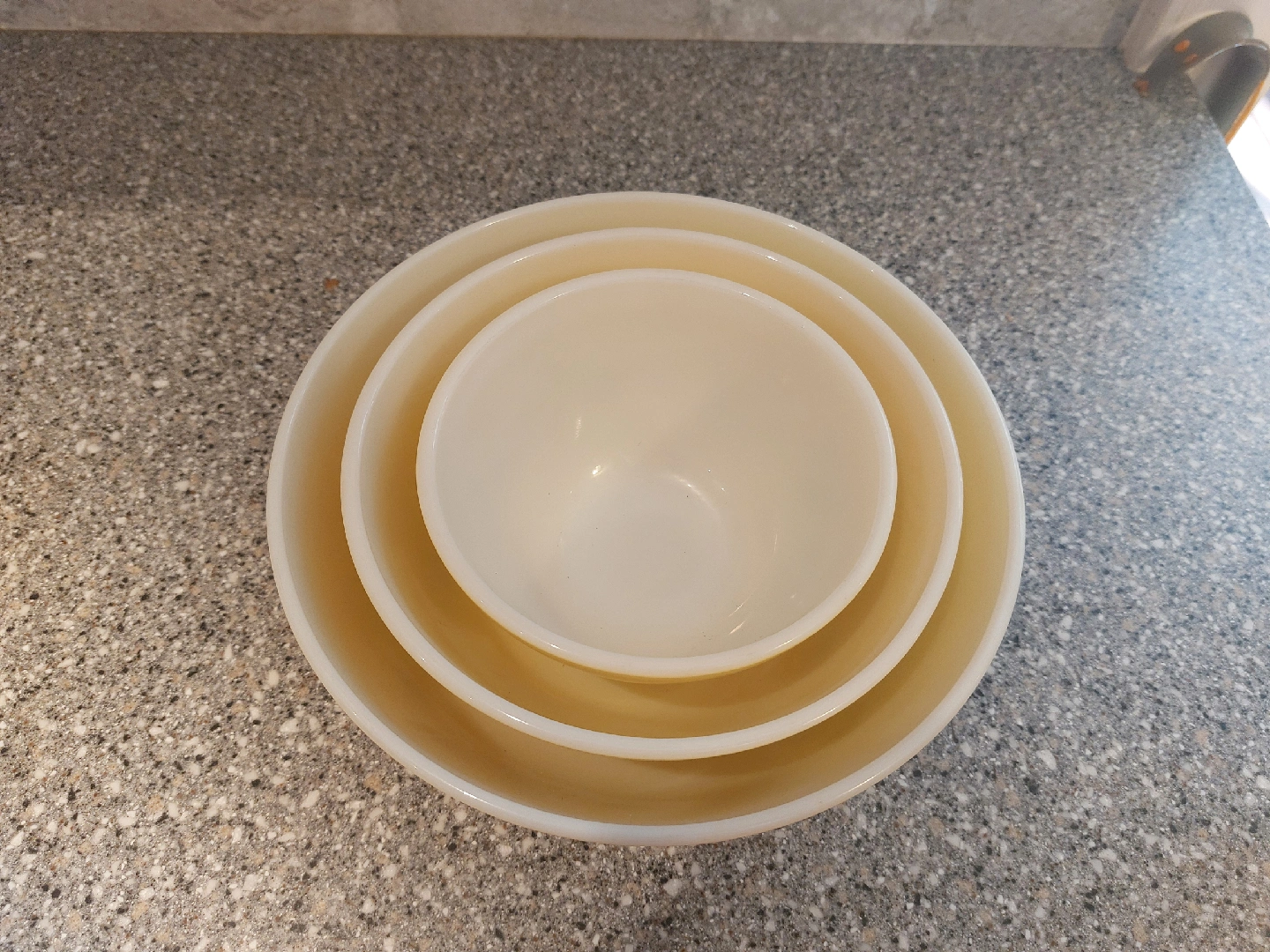Selling a set of vintage Pyrex Shenandoah mixing bowls! They are a lovely light yellow colour with a delicate floral leaf pattern. There are some signs of wear and scratches, as shown in the photos, no crackling noted on the inside of tge bowels, but they're still in good condition for their age. P/U near Blundell and Gilbert roads in Richmond. Door pickup only. Prefer cash please.