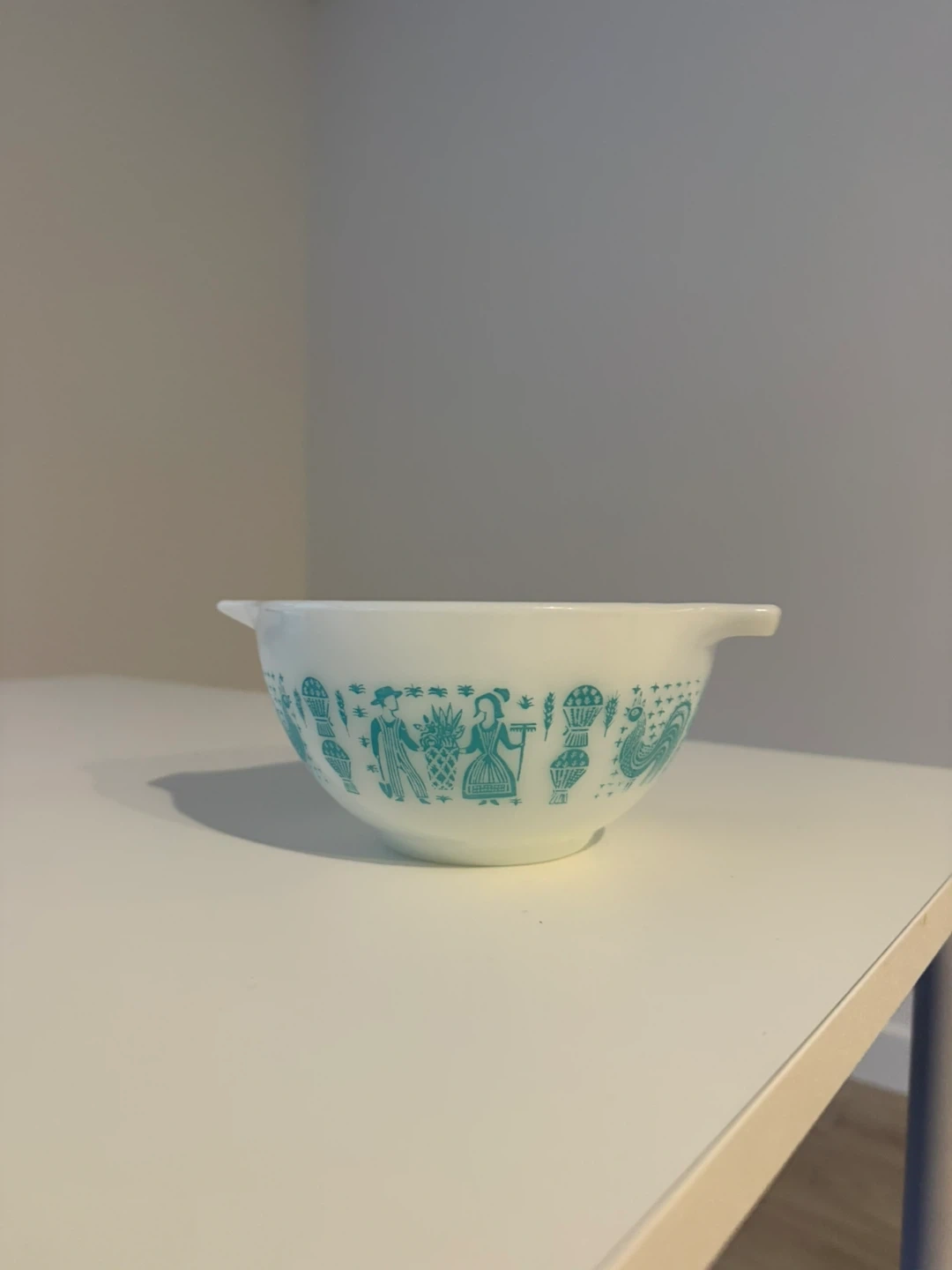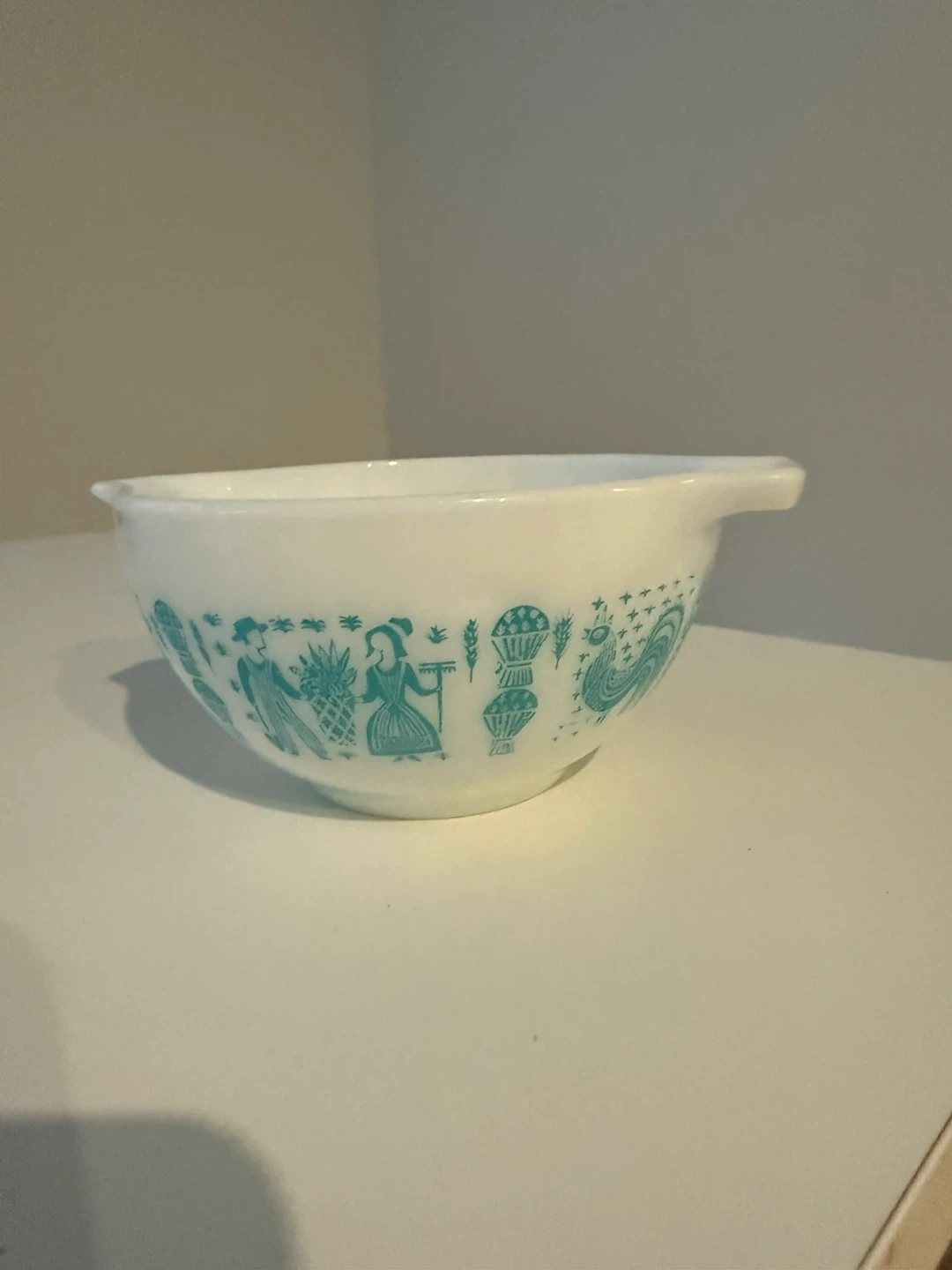 Selling a vintage Pyrex mixing bowl in the Early American pattern. It features a charming turquoise design on a white background. Perfect for collectors or anyone who loves retro kitchenware!