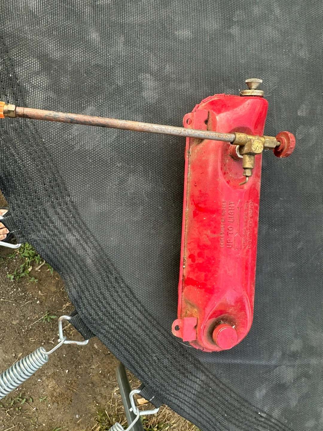 Selling a vintage red Coleman fuel tank., but it still has a lot of charm! The tank reads 'Up to Light' and 'Down to Burn'.
