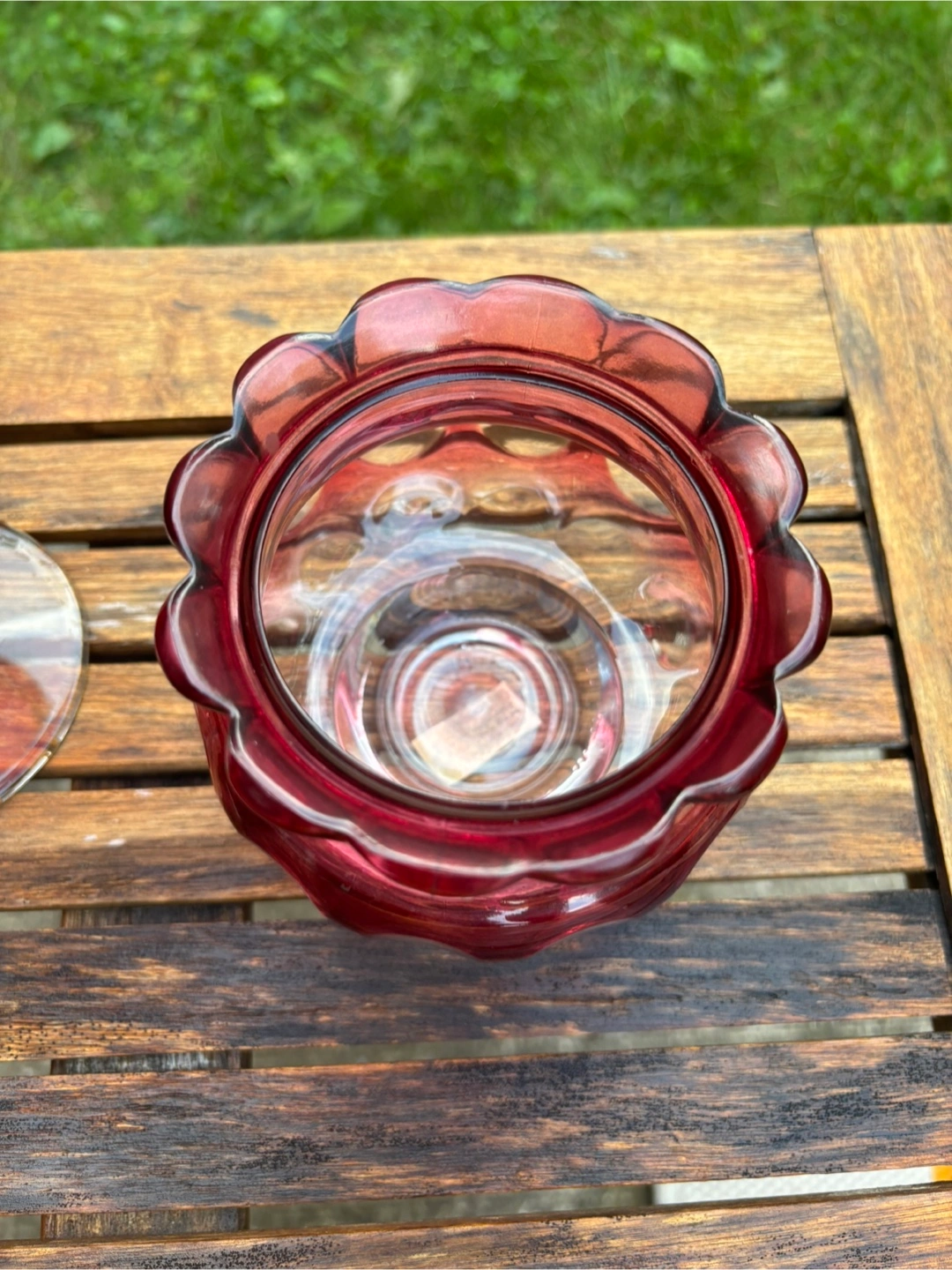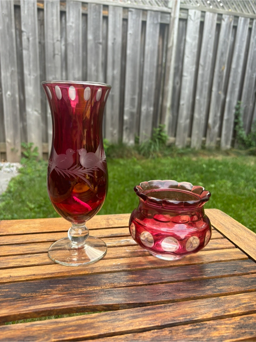 Selling a beautiful vintage red glass vase and bowl set. The vase features an etched bird design, and the bowl has a unique floral shape. Sold as a set Can be sold individually