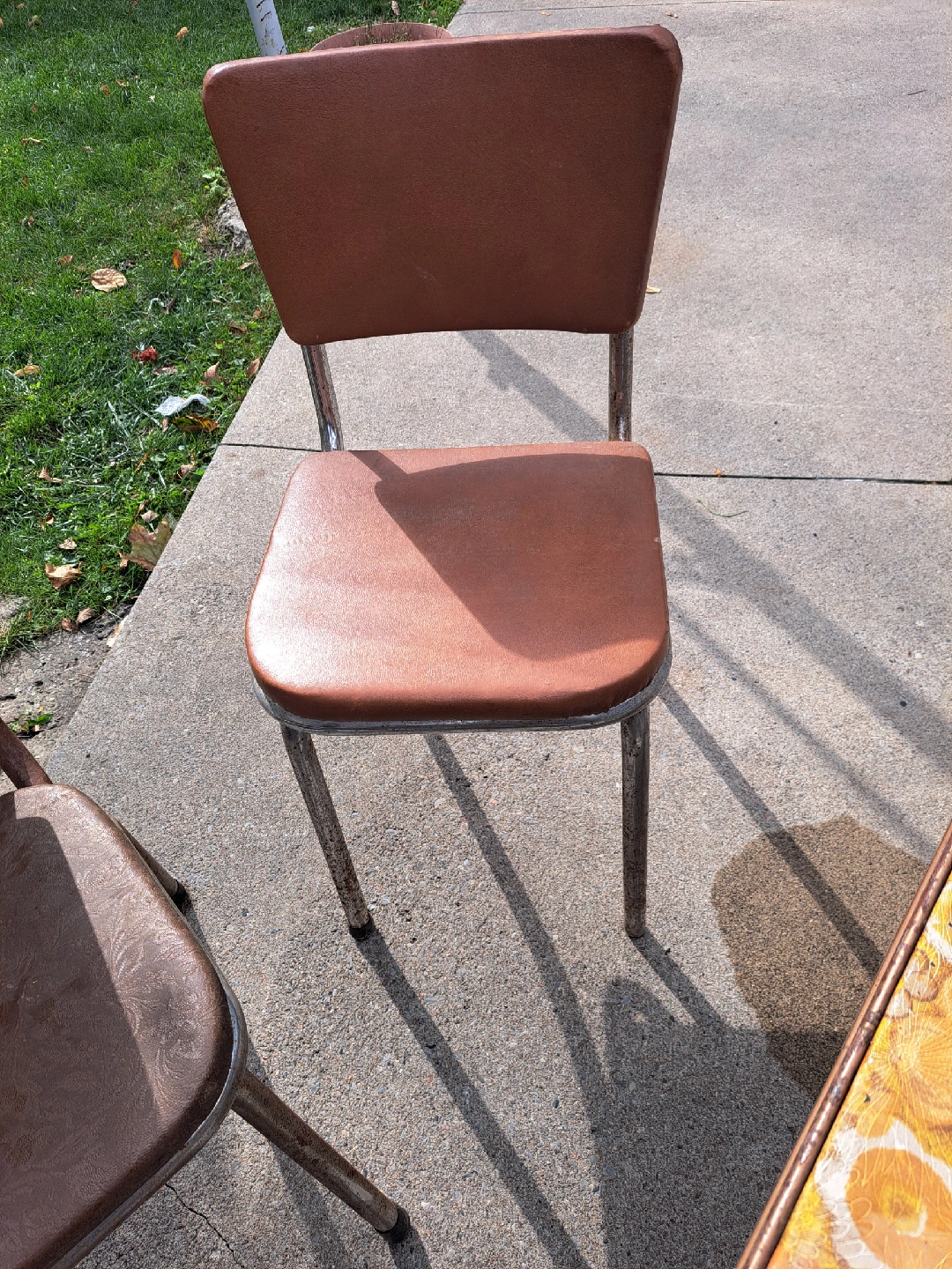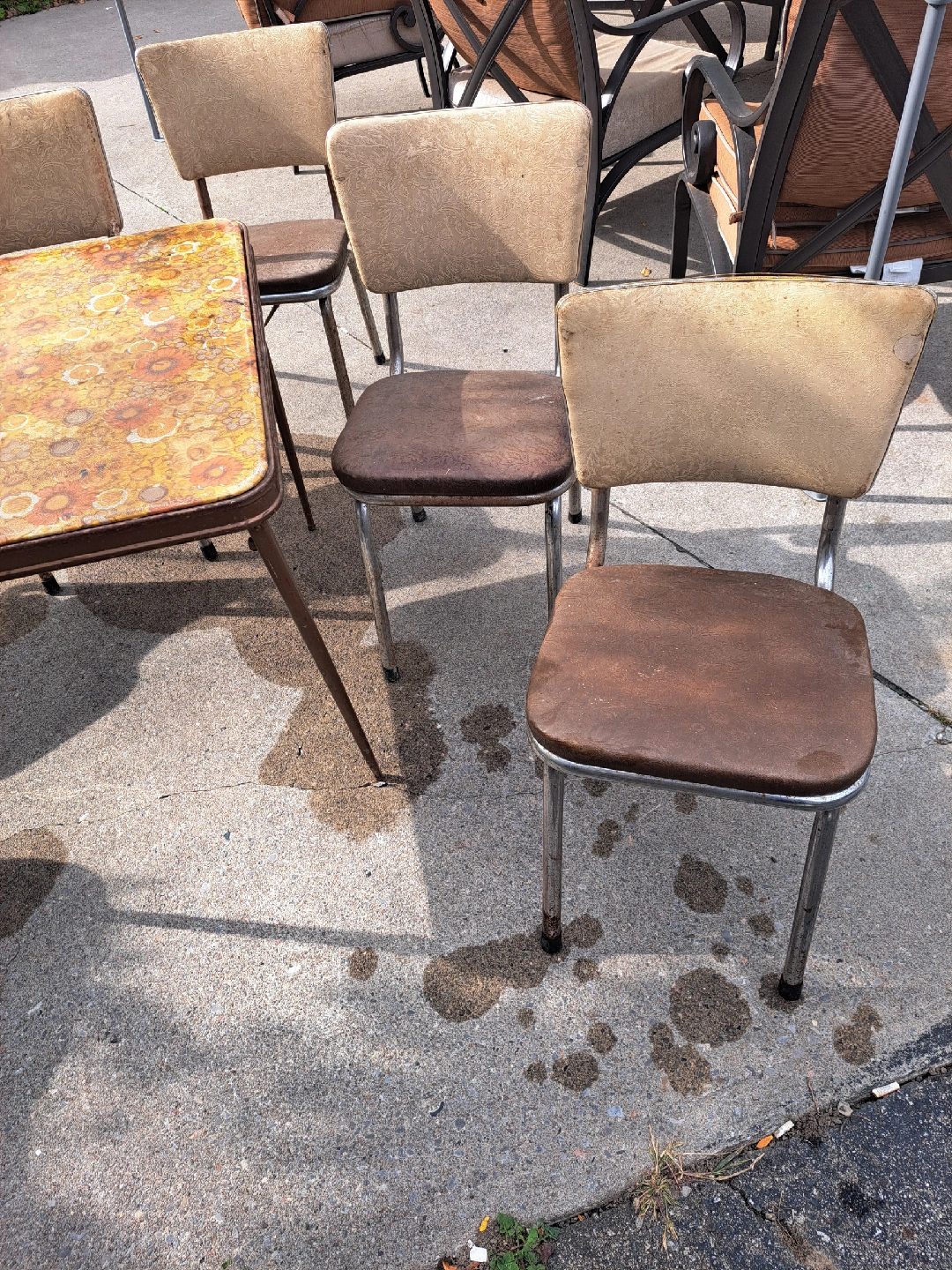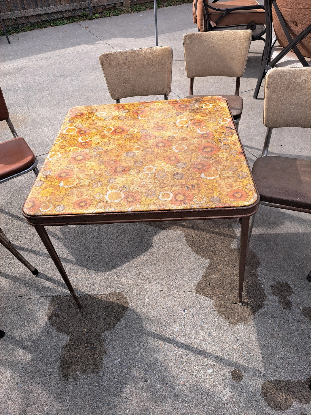 Classic vintage dining set featuring a retro table with a patterned top and six matching metal-frame chairs. The chairs have original vinyl upholstery in mixed brown and tan tones with chrome legs, showing natural wear consistent with age. The table has a bold 1950s floral design, perfect for a retro, farmhouse, or upcycling project. Condition: Used, with visible wear and patina on the metal and upholstery.