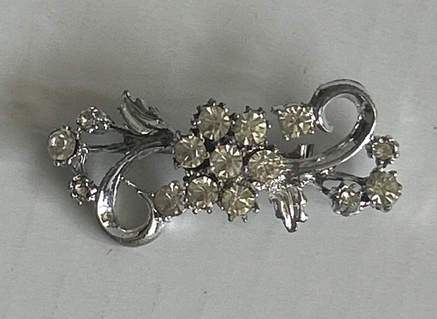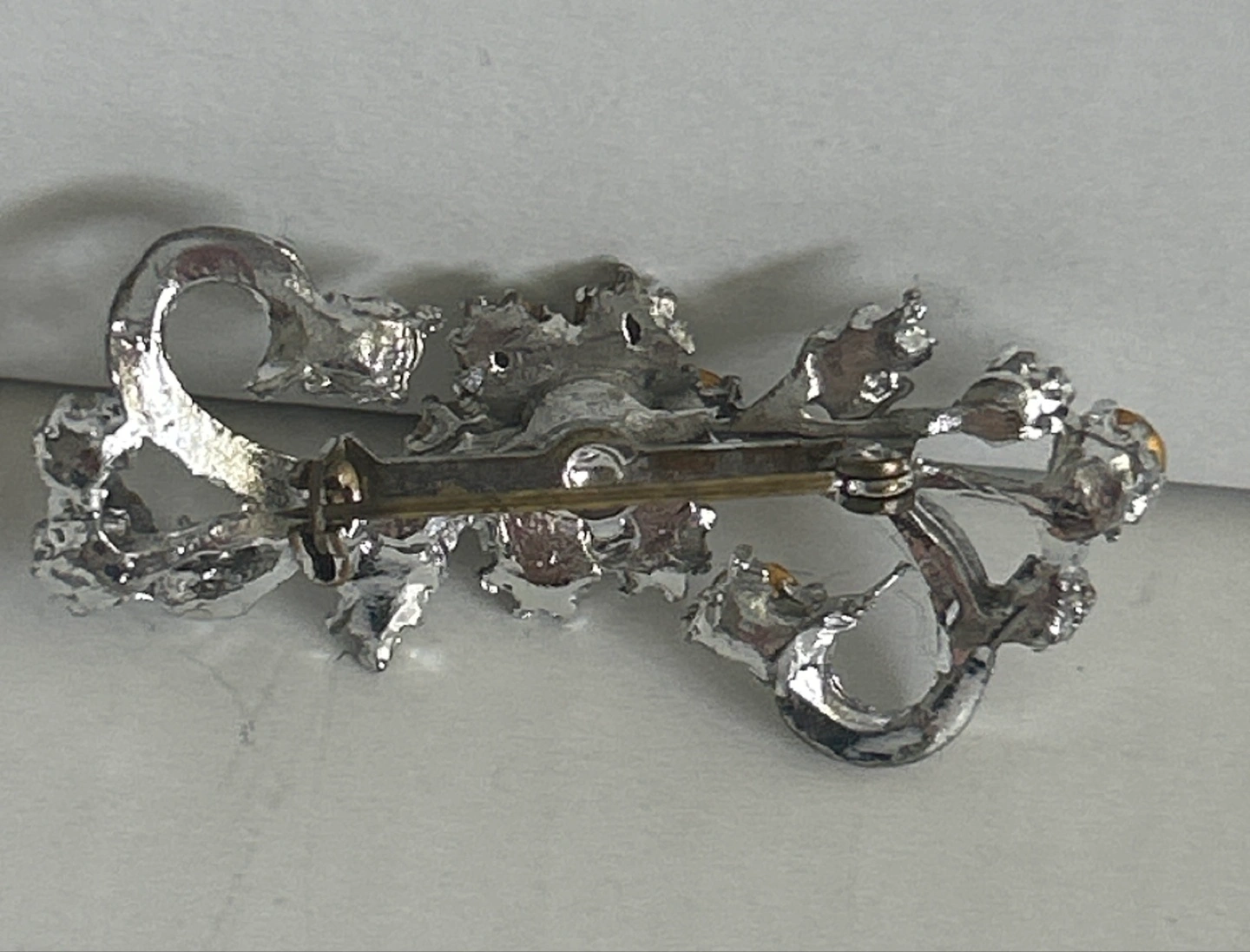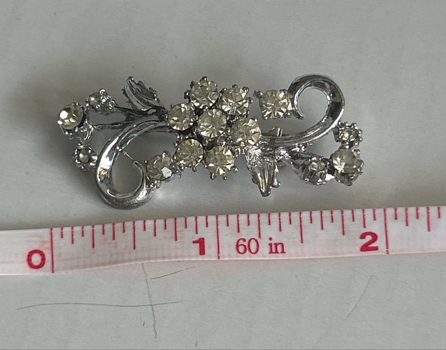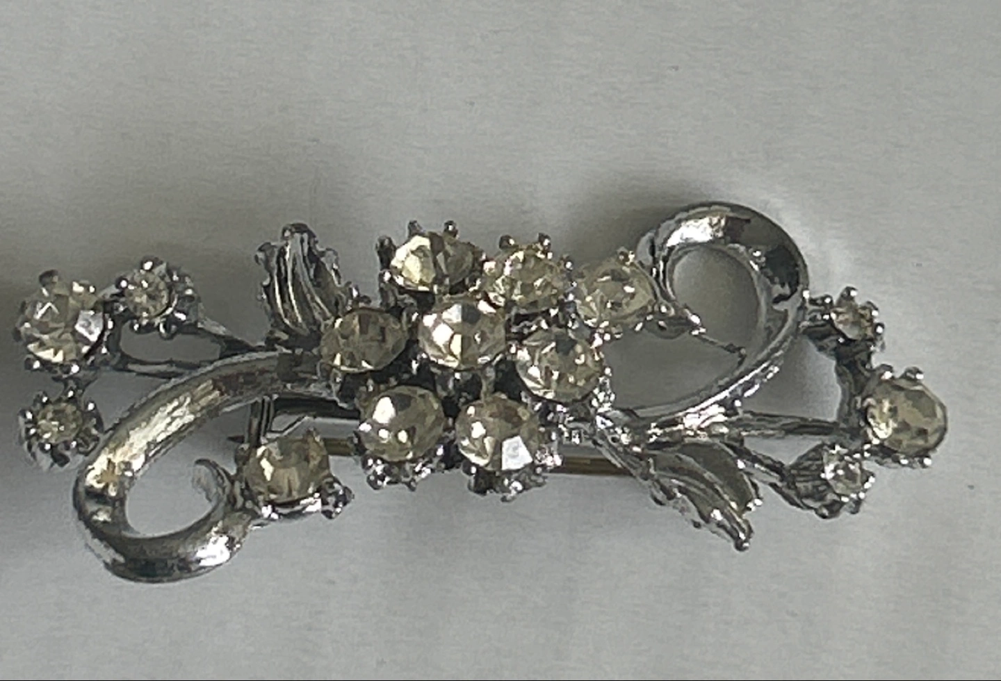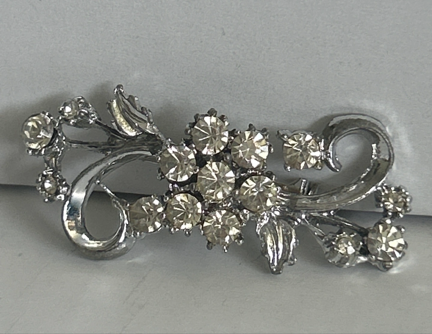 Beautiful silver-tone metal brooch. Features clear rhinestones arranged in a floral design. Looks great on a jacket or dress. Excellent condition and good quality product. No missing stones. Smoke/Pet free home. Cash & pick up only available.
