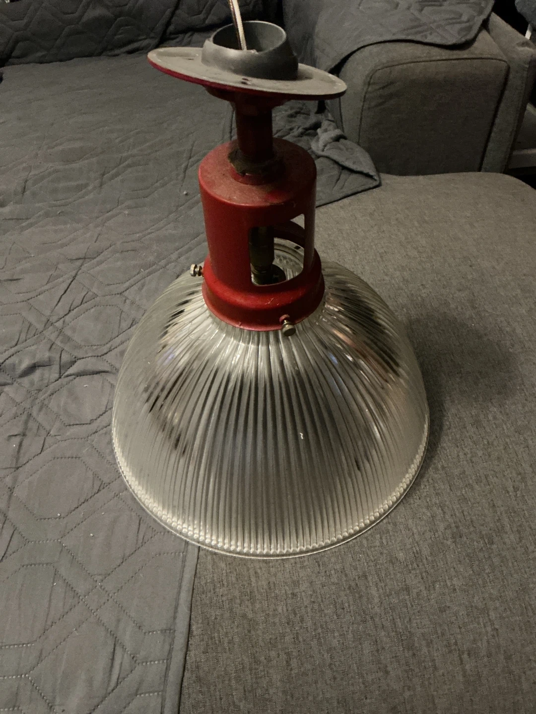 Selling a vintage ribbed glass ceiling light fixture. It has a clear glass shade with a ribbed design and a red metal fixture. This unique piece would add a touch of retro charm to any room