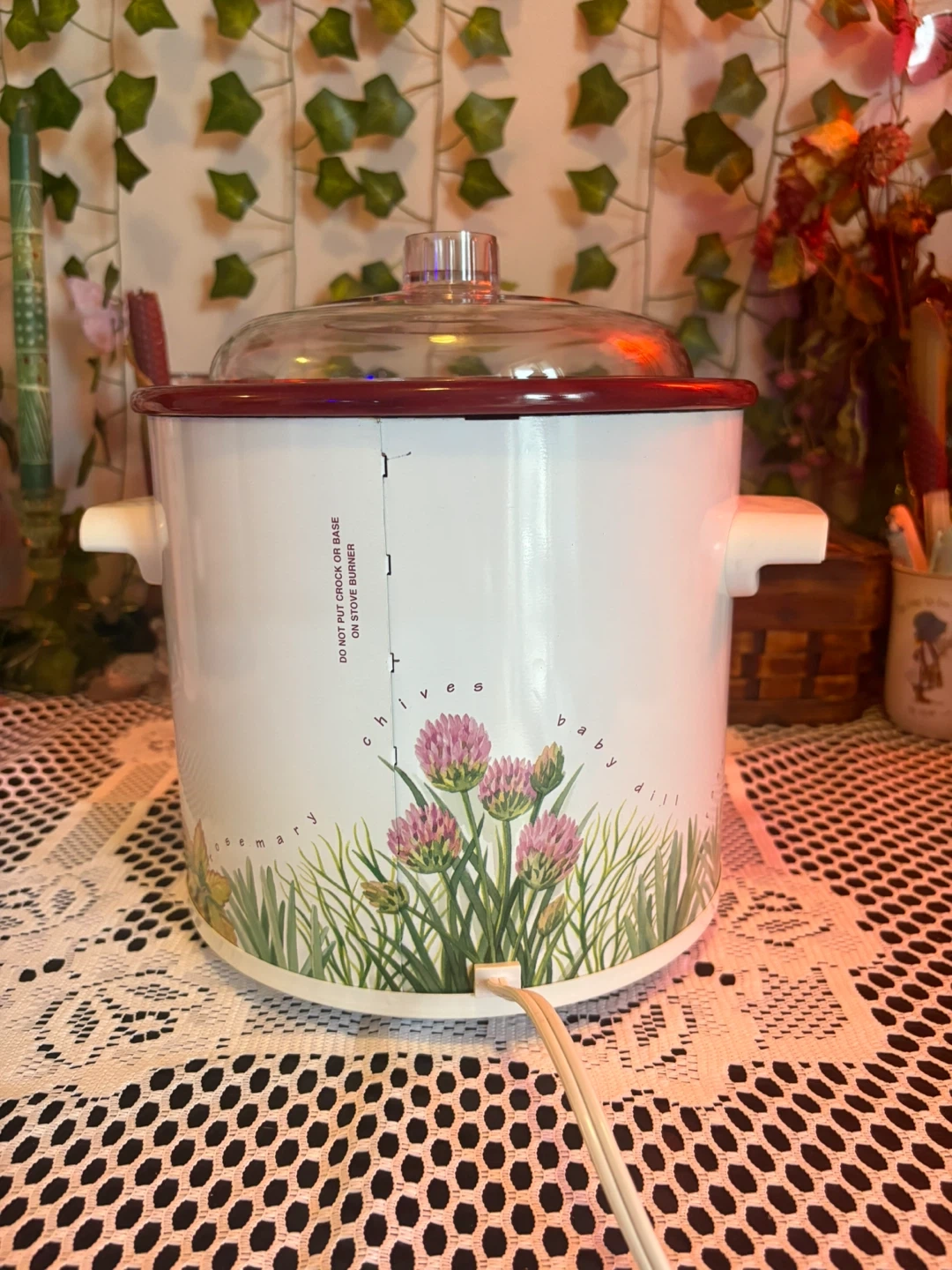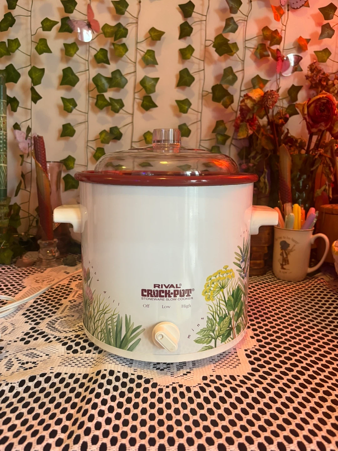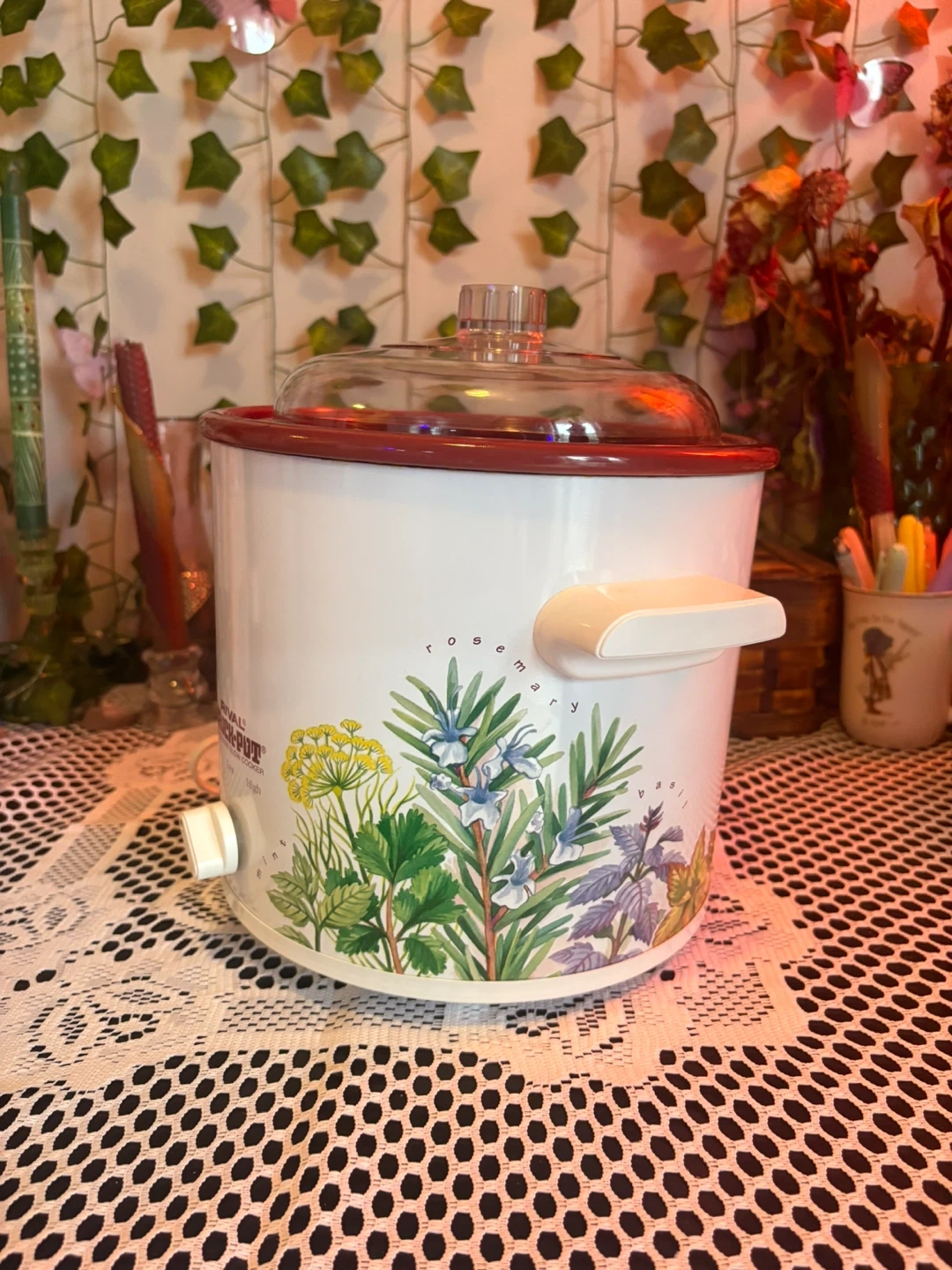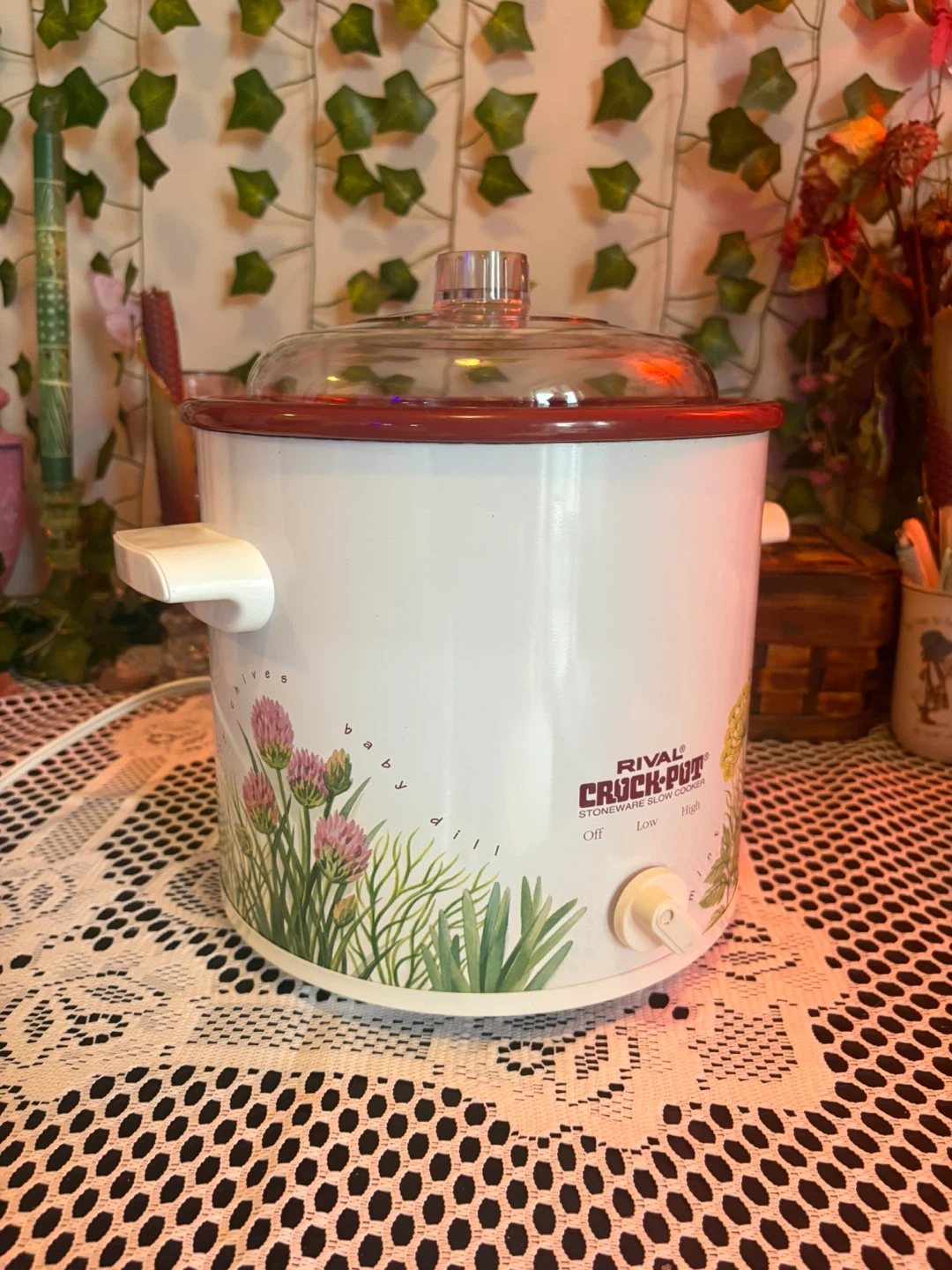 Charming vintage Rival Crock-Pot with a botanical herb design featuring rosemary, chives, and dill. Compact and perfect for soups, dips, small meals & cozy kitchen décor. Details: • Model: Rival Crock-Pot Stoneware Slow Cooker • Settings: Off / Low / High • Ceramic inner pot with red glaze + durable plastic lid • Works perfectly, heats evenly • Approx. 2–3 quart capacity (small size) • Great condition: clean inside and out, minimal wear (see photos). Adorable vintage kitchen piece that’s both functional and decorative. Perfect for cottagecore, farmhouse, or cozy retro setups.