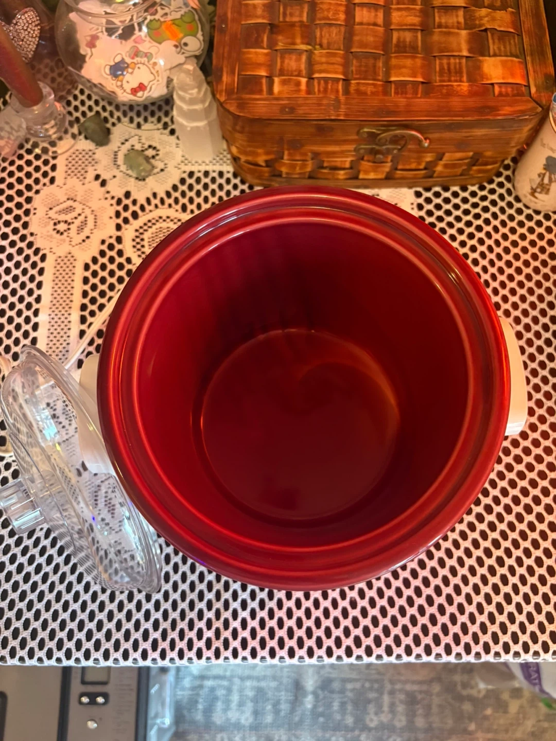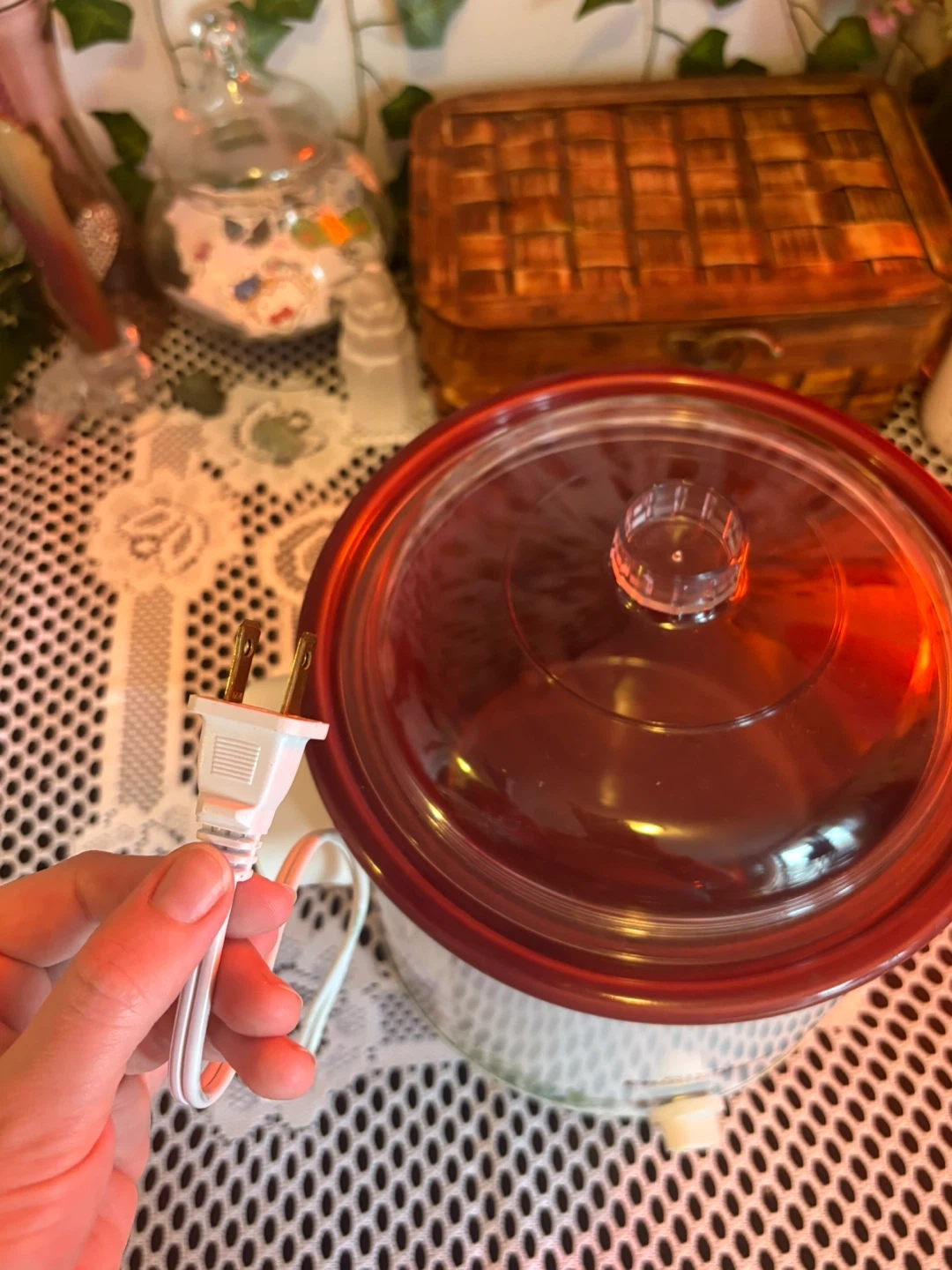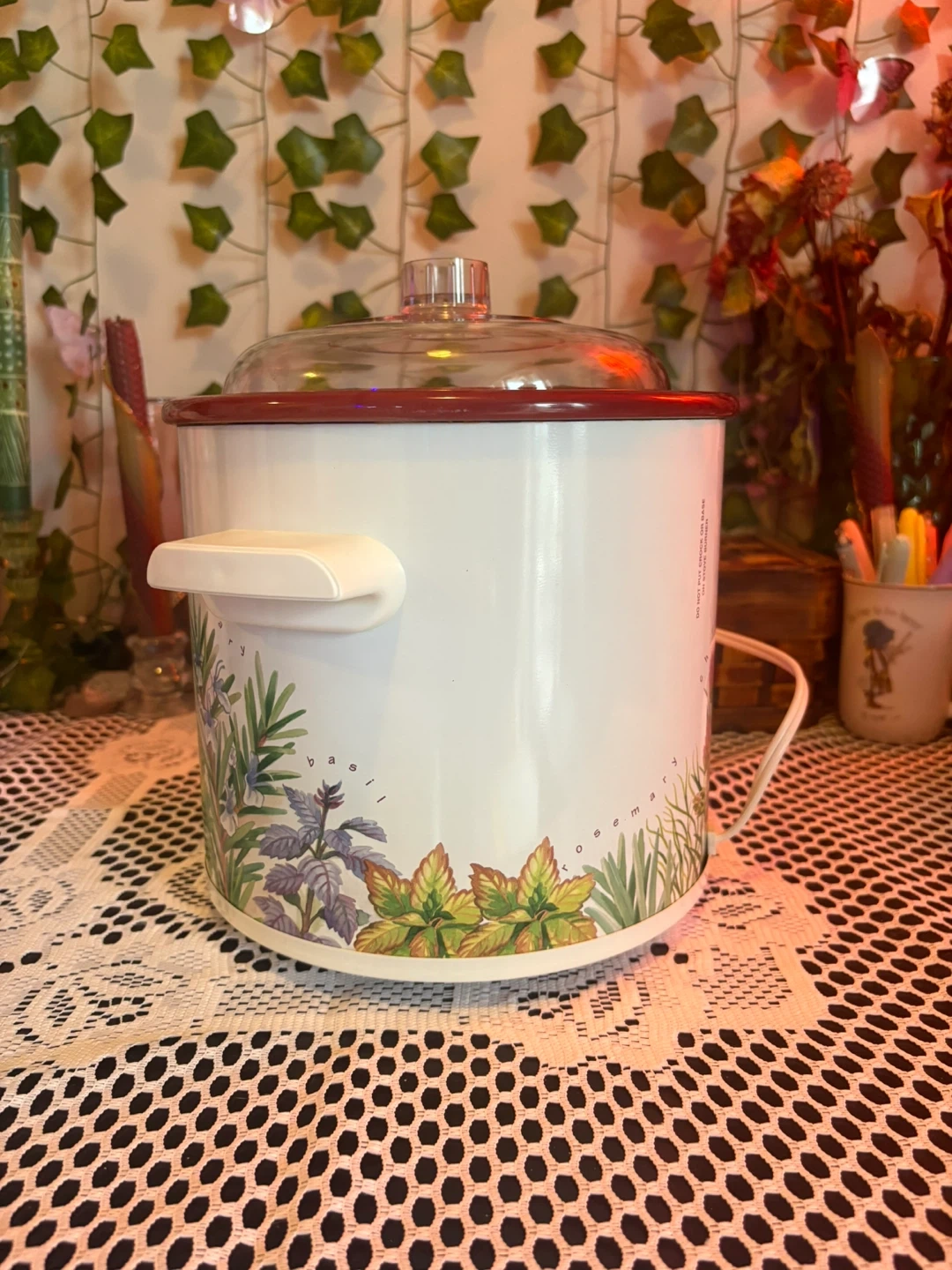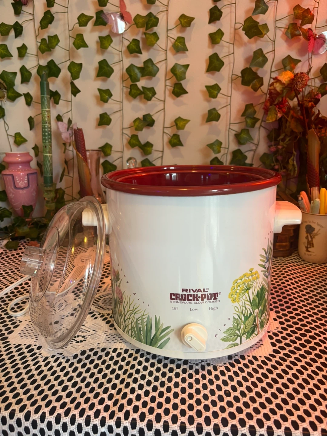 Charming vintage Rival Crock-Pot with a botanical herb design featuring rosemary, chives, and dill. Compact and perfect for soups, dips, small meals & cozy kitchen décor. Details: • Model: Rival Crock-Pot Stoneware Slow Cooker • Settings: Off / Low / High • Ceramic inner pot with red glaze + durable plastic lid • Works perfectly, heats evenly • Approx. 2–3 quart capacity (small size) • Great condition: clean inside and out, minimal wear (see photos). Adorable vintage kitchen piece that’s both functional and decorative. Perfect for cottagecore, farmhouse, or cozy retro setups.