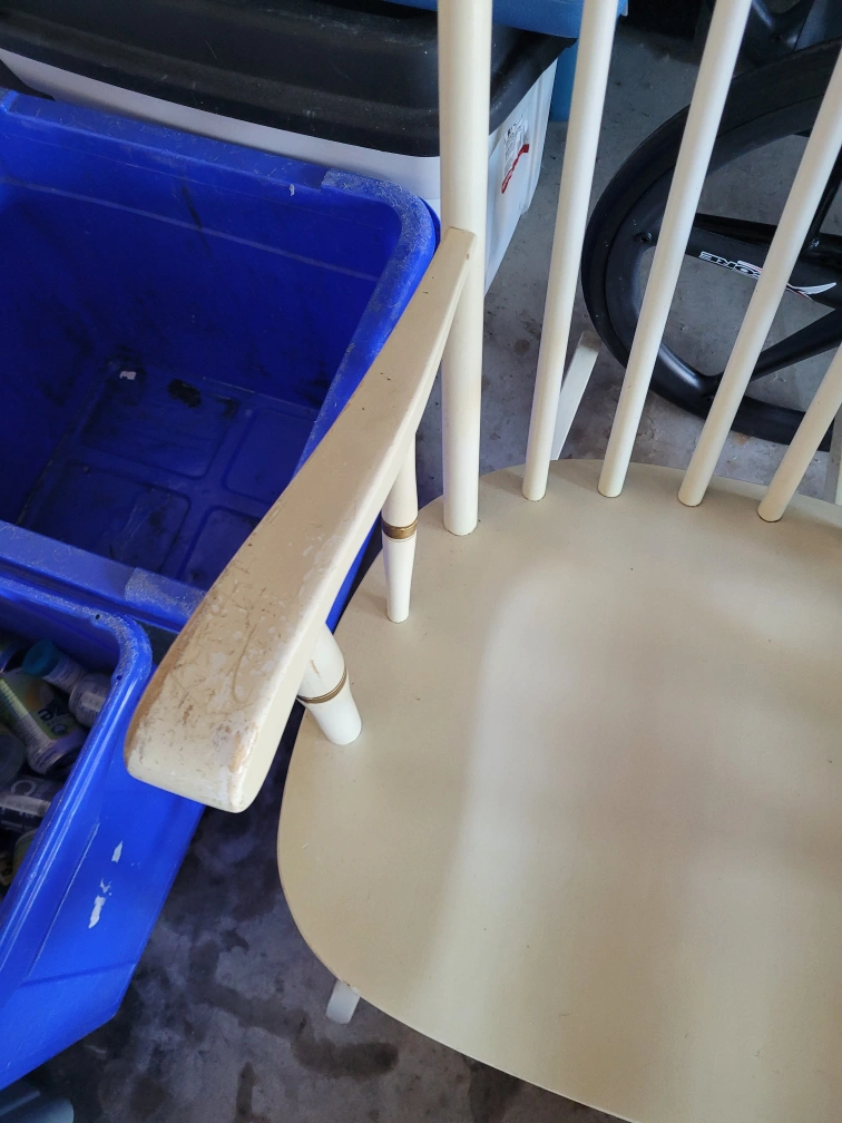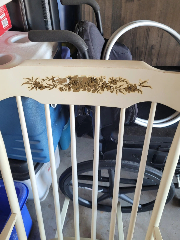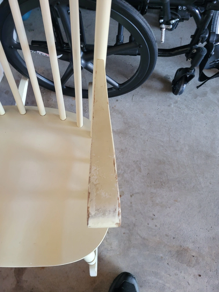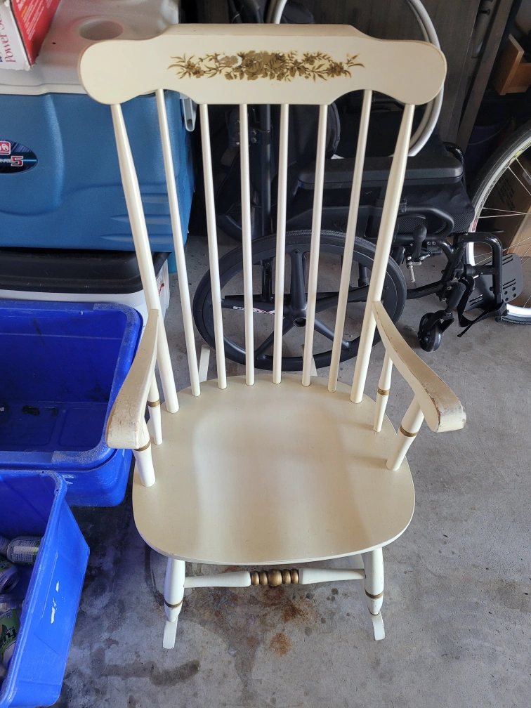 Selling a vintage rocking chair in a cream colour. It has a lovely floral design on the top. There are some signs of wear on the armrests, but it's still a charming and functional piece for your home