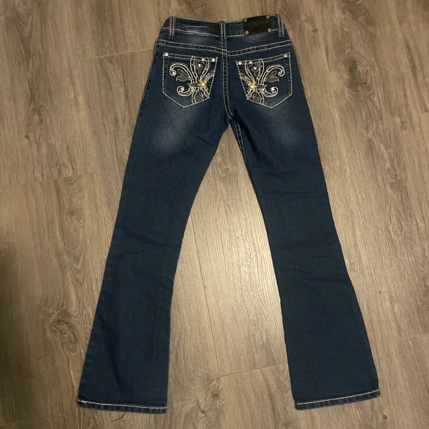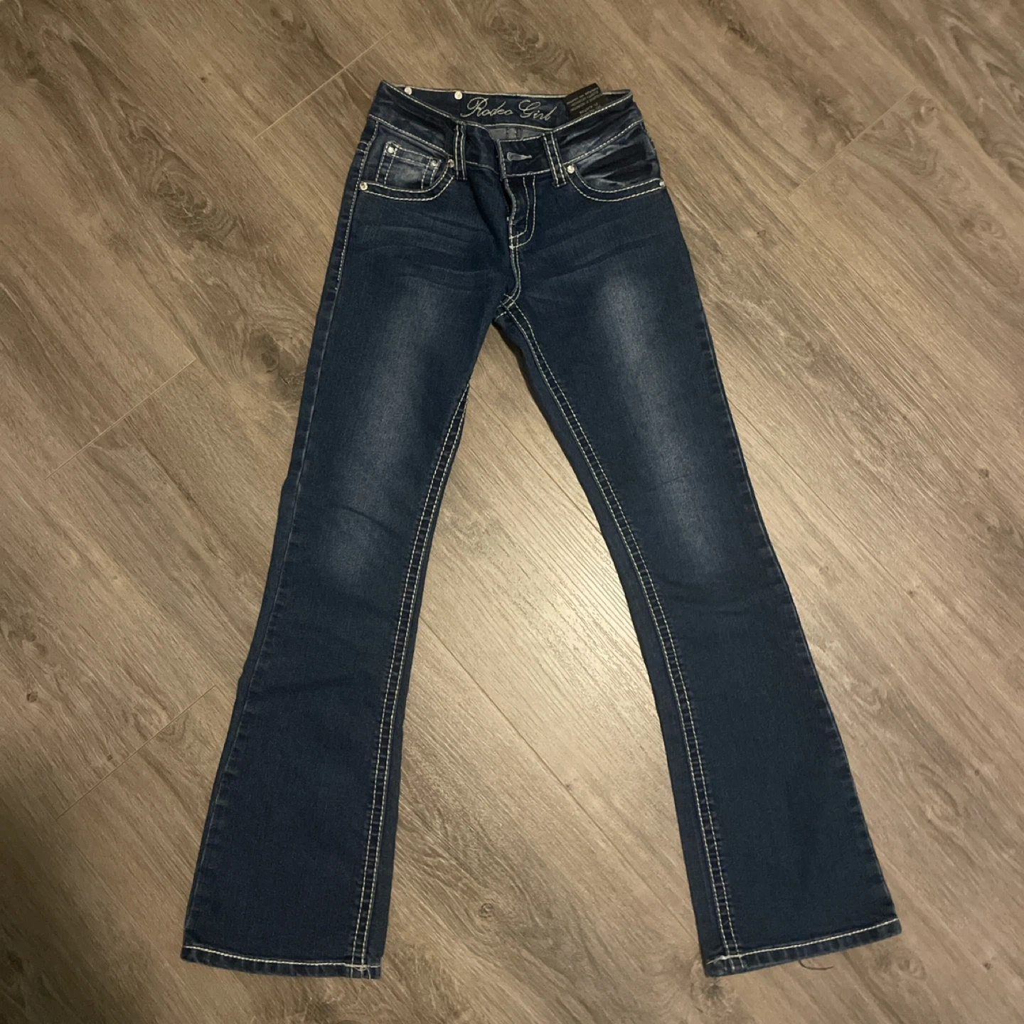 Dark wash vintage Rodeo Girl flared jeans with embroidered back pockets. Size 23/24 They're in great shape and ready for a new home!