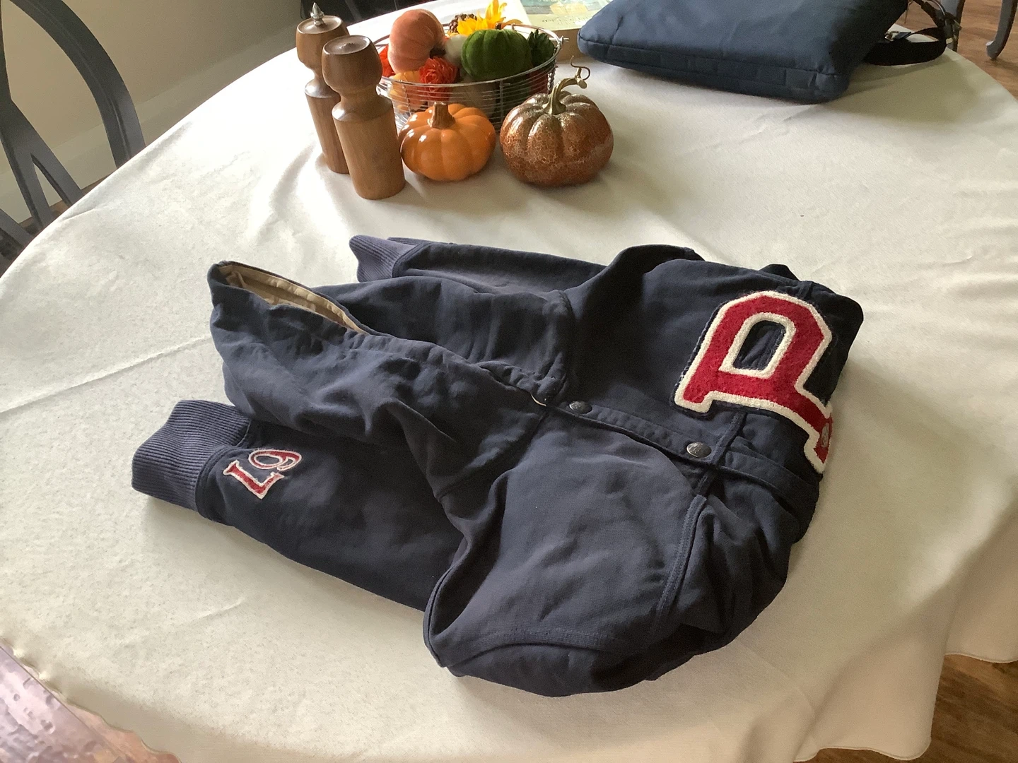 Selling a vintage Roots letterman jacket in blue. It has a red and white 'R' on the front and a smaller 'LV' logo on the sleeve. It's in good condition and would be a great addition to any wardrobe!