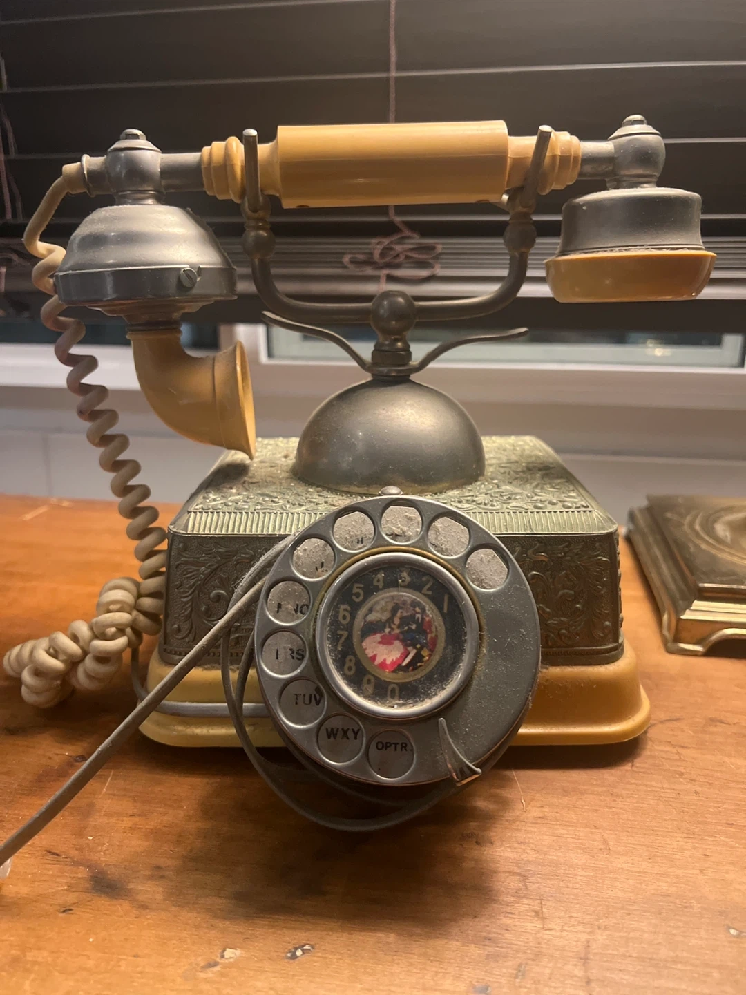 Selling a vintage Radio Shack rotary dial telephone. It has metal decorative design with a rotary dial and a classic handset. Trinket or prop