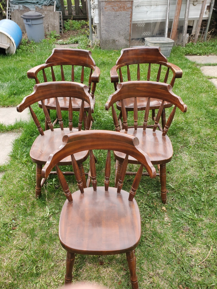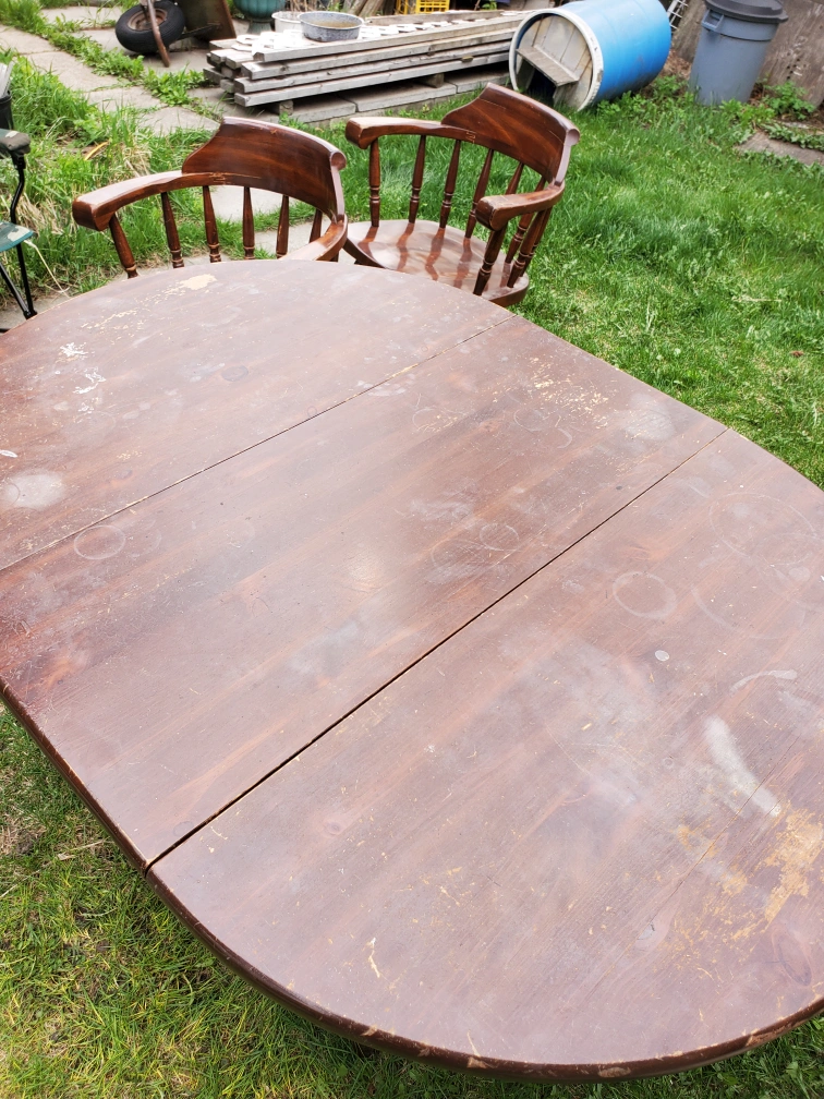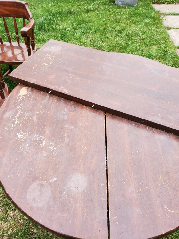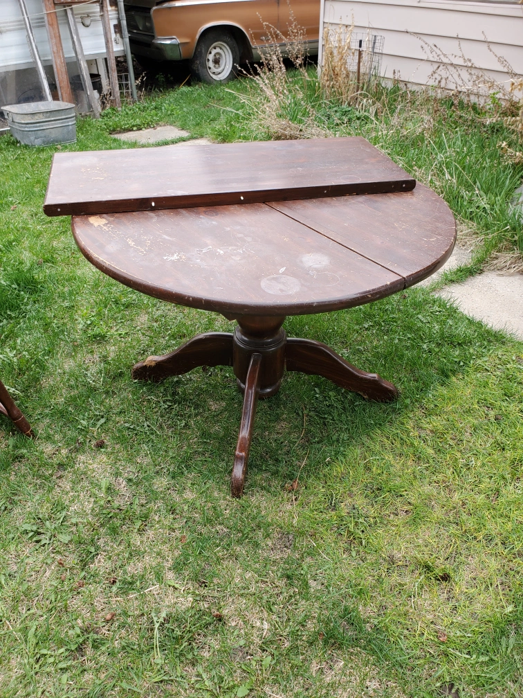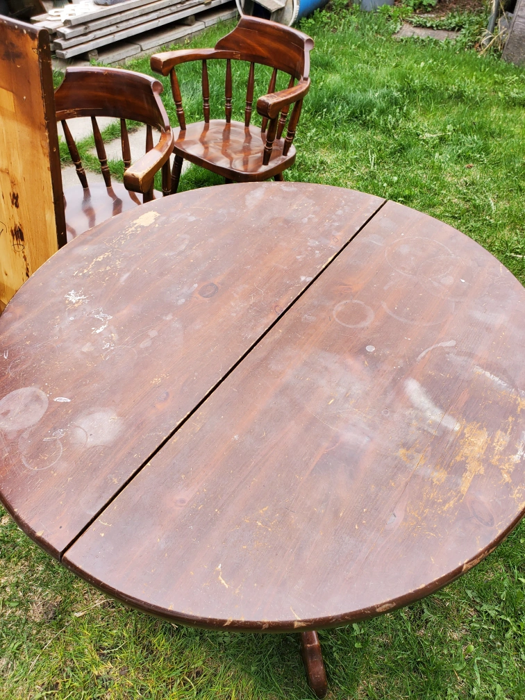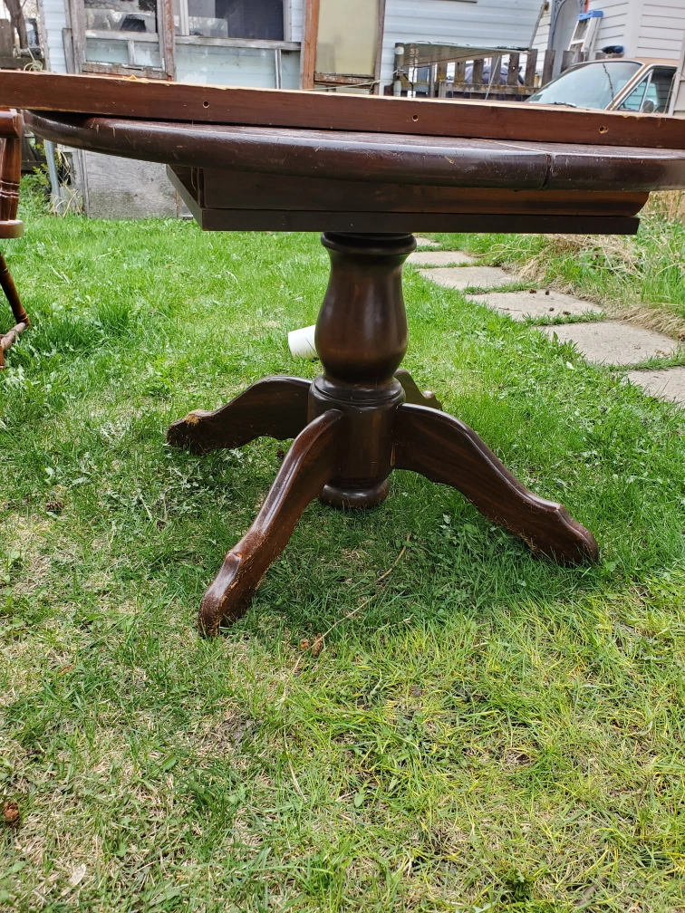 Solid wood table and chairs. Table is round and has a leaf. Some wear and tear on the table, great for a DYI project to get a beautiful piece for cheap. Table Diameter: 43" Leaf Width: 18"