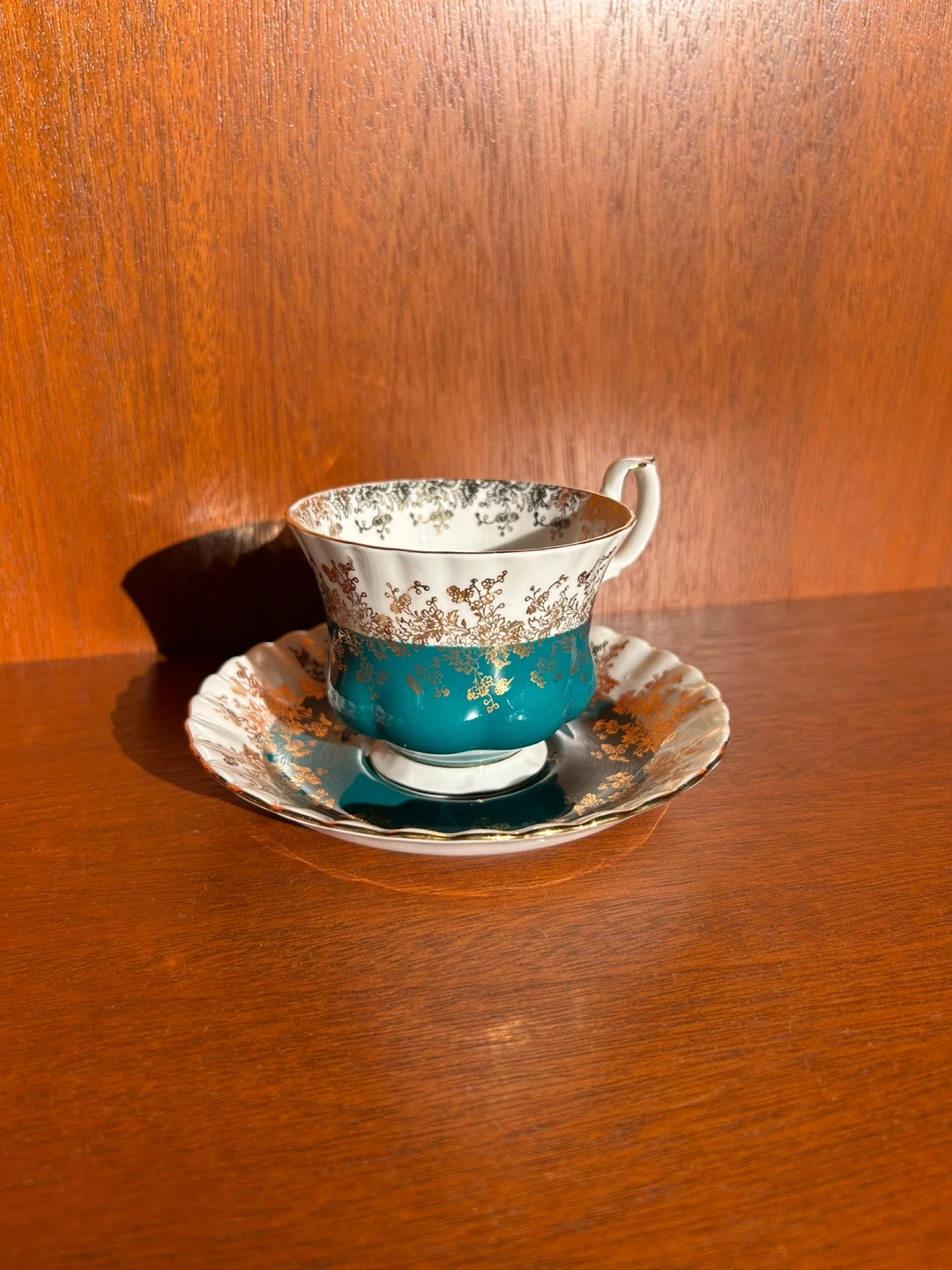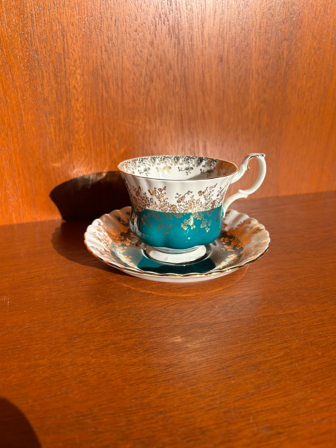Beautiful vintage Royal Albert teacup and saucer set. It features a lovely teal and gold design. Perfect for tea time or displaying in your china cabinet!