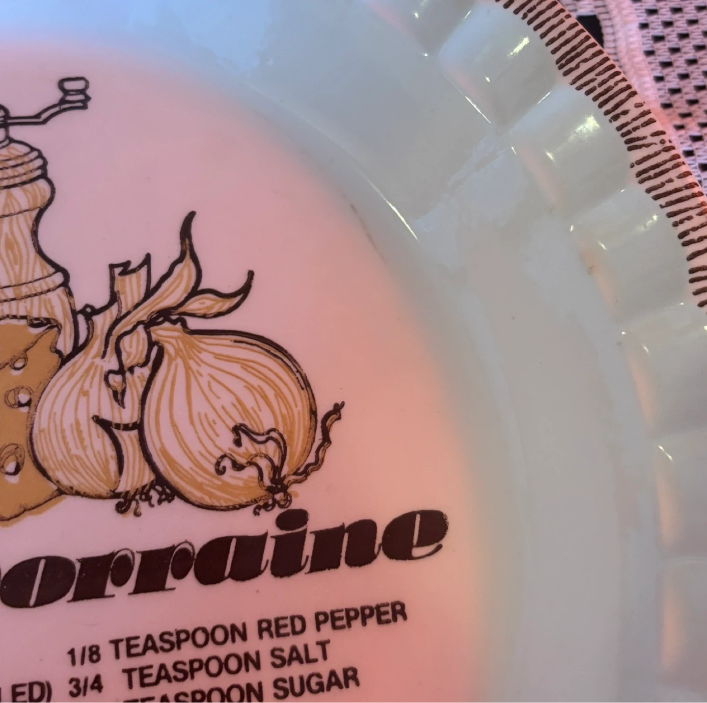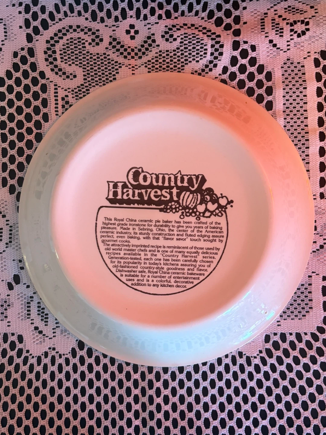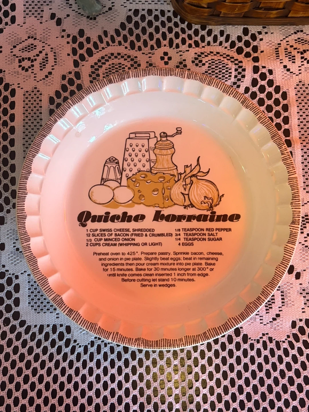 Beautiful vintage Royal China ceramic pie plate featuring the Quiche Lorraine recipe printed right on the front. From the “Country Harvest” series; loved for its creamy glaze, rustic design, and collectible mid-century kitchen charm. Details: • Measures approx. 11″ W × 1.75″ H • Made in the USA by Royal China • “Country Harvest” series • Quiche Lorraine recipe design • Oven and dishwasher safe ceramic bakeware • Great vintage condition: a couple of small glaze imperfections and a faint surface line near the lettering (shown in photos). Purely cosmetic and doesn’t affect use or structure. Perfect for display, serving, or adding a nostalgic farmhouse touch to your kitchen décor.
