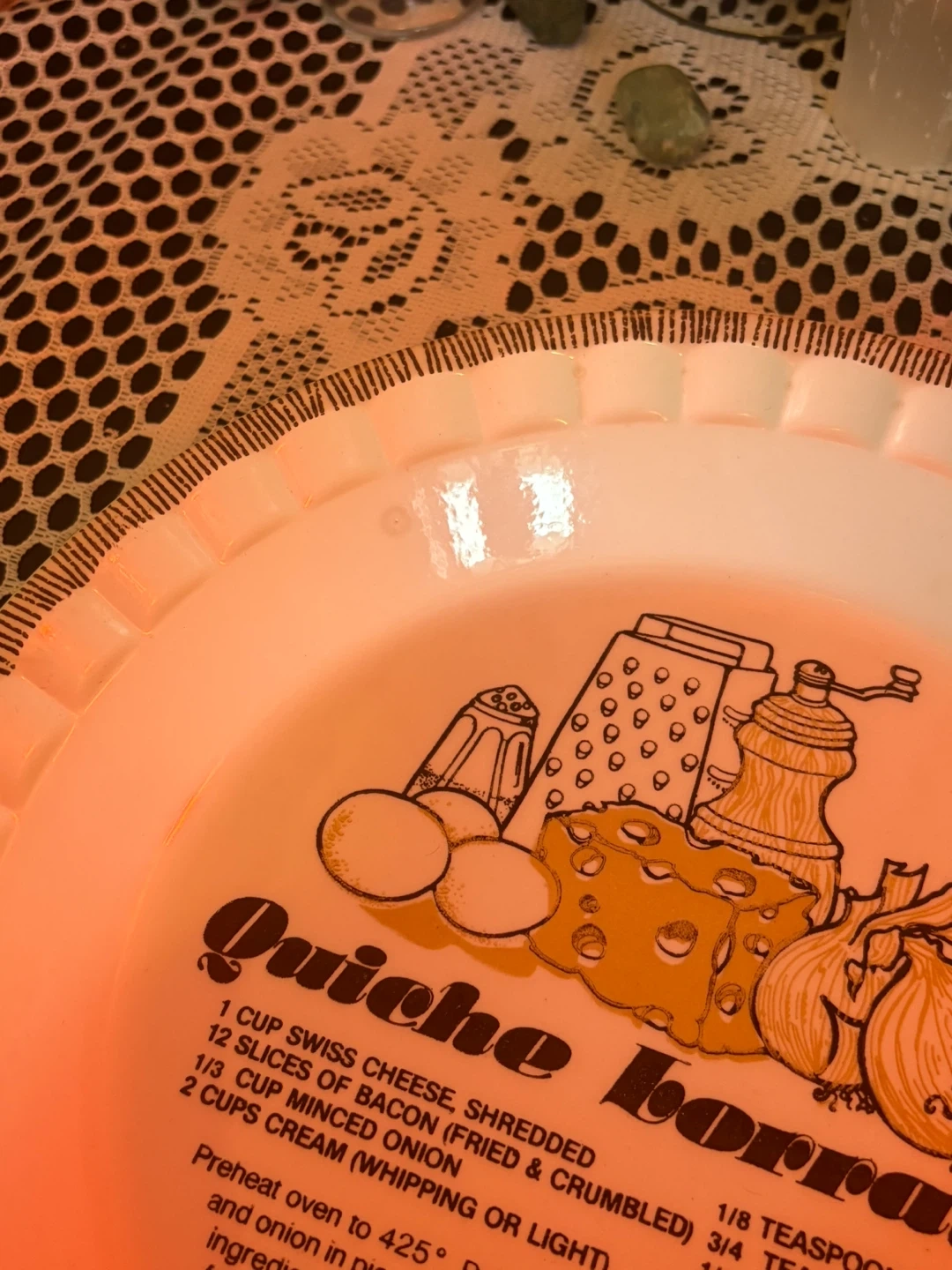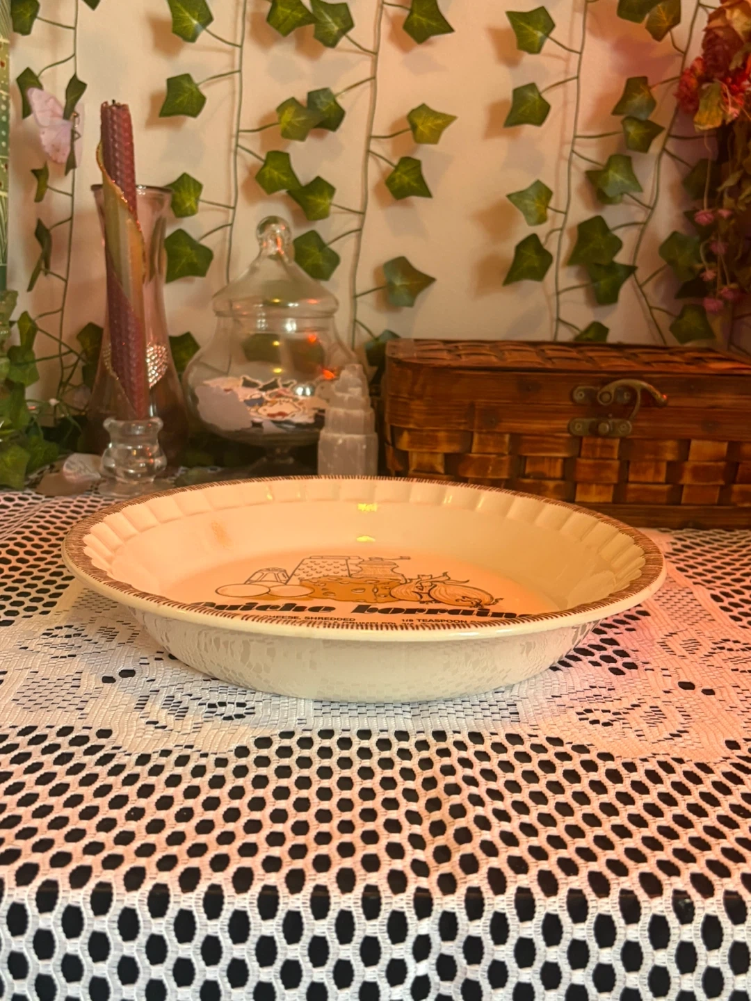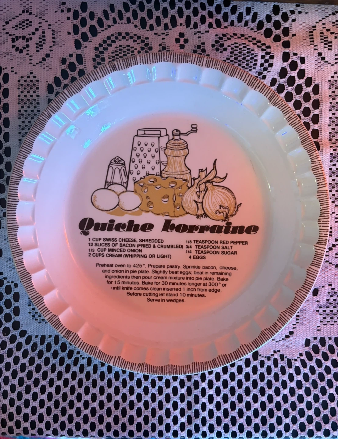 Beautiful vintage Royal China ceramic pie plate featuring the Quiche Lorraine recipe printed right on the front. From the “Country Harvest” series; loved for its creamy glaze, rustic design, and collectible mid-century kitchen charm. Details: • Measures approx. 11″ W × 1.75″ H • Made in the USA by Royal China • “Country Harvest” series • Quiche Lorraine recipe design • Oven and dishwasher safe ceramic bakeware • Great vintage condition: a couple of small glaze imperfections and a faint surface line near the lettering (shown in photos). Purely cosmetic and doesn’t affect use or structure. Perfect for display, serving, or adding a nostalgic farmhouse touch to your kitchen décor.