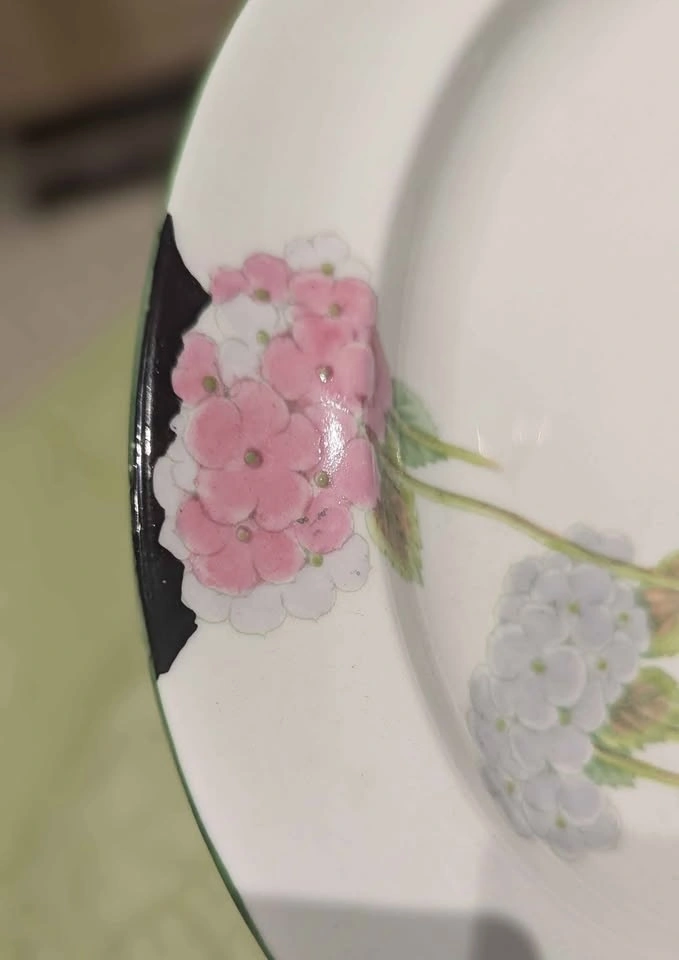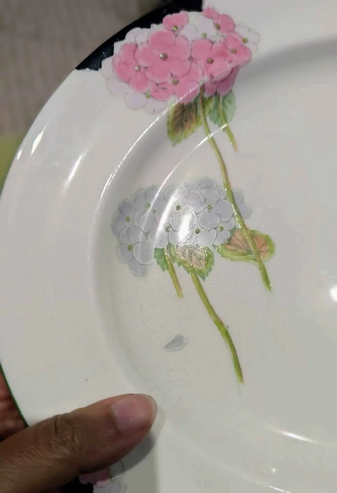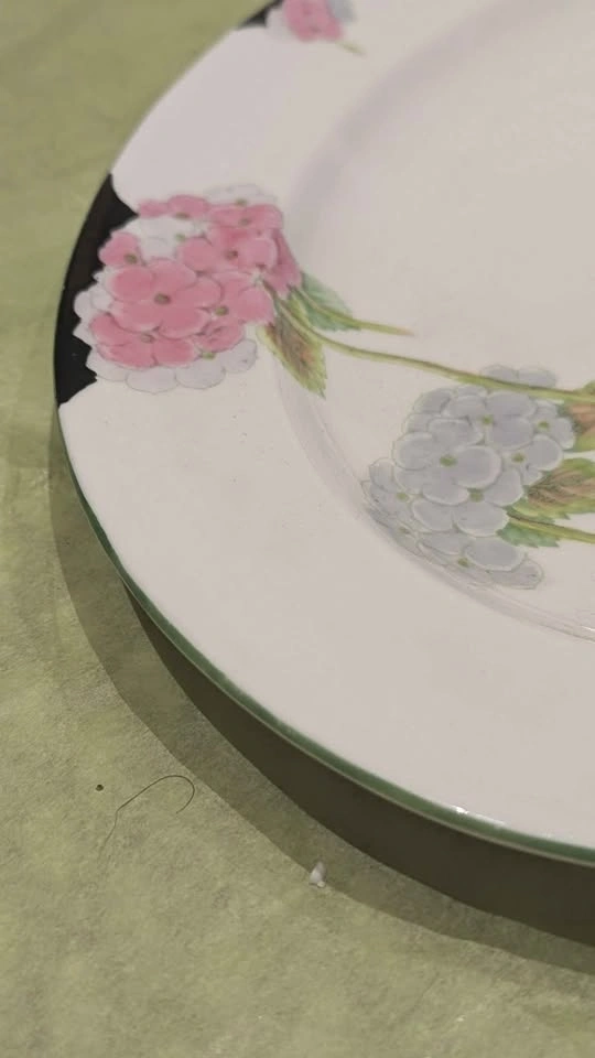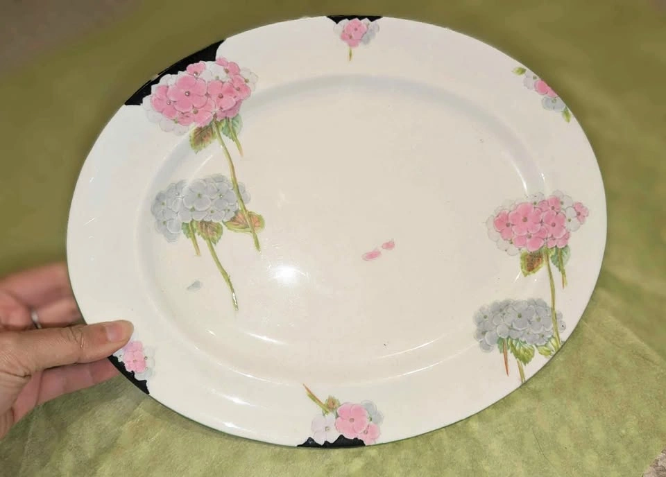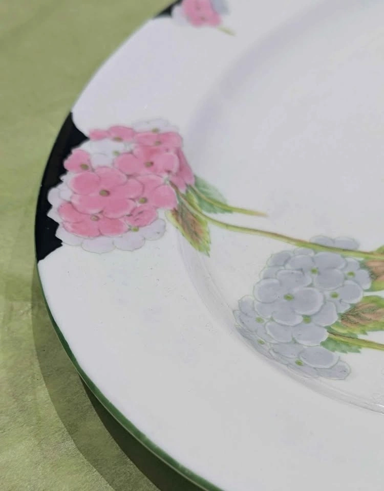 Charming vintage Royal Ironstone China plate, made in England as a “Reproduction of Service made for Her Majesty Queen Mary.” Features delicate hand-painted pink and lavender hydrangeas with black and green accent edges.