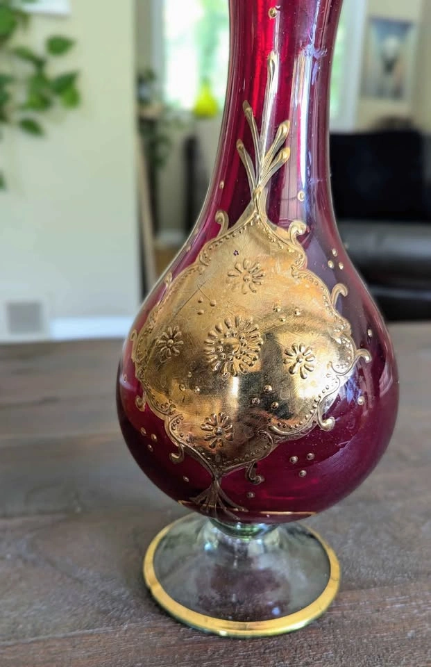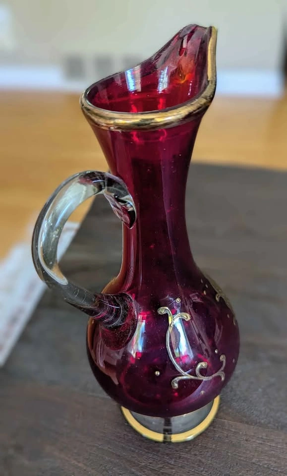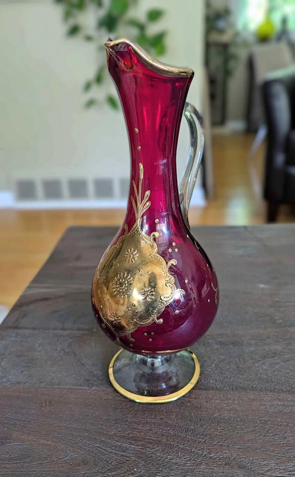 Beautiful vintage Bohemian Moser-style ruby red art glass pitcher with gold enamel and gilt decoration. No chips or cracks, some wear on the gilt consistent with age.
