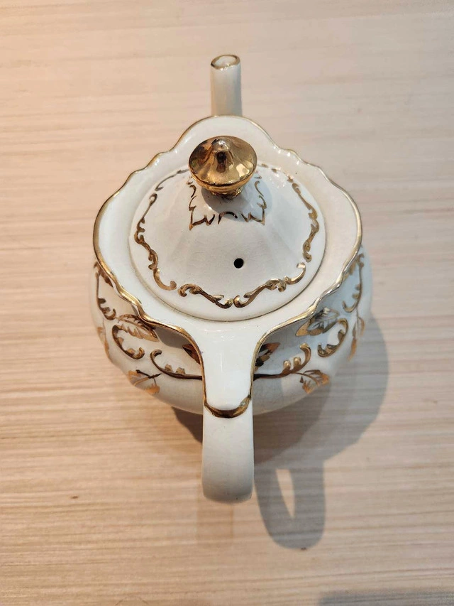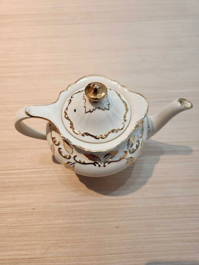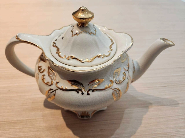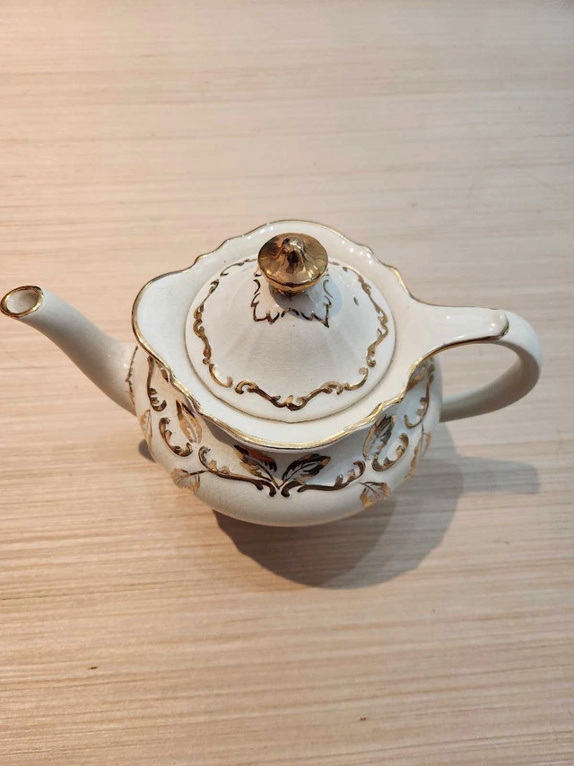 Adorn your tea table with this charming Sadler teapot, showcasing a delicate ivory hue and intricate gold detailing, perfect for adding a touch of vintage elegance to your collection. Asking $40 or best offer. If the ad is up it's still available. Thanks.