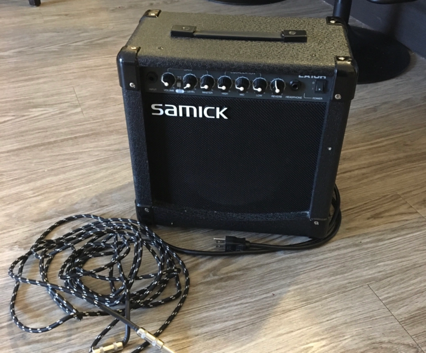 This Samick LA10R guitar amplifier is perfect for practice or small jam sessions, delivering clear sound in a compact package. This amp is in barely used, but good working condition, ready to plug in and play. It’s a great option for beginners or anyone needing a portable amp solution. Also including a barely used 1/4 cable cord for your guitar. * 10 Watts * 6.5-inch speaker * Volume, Treble, and Bass controls * Headphone jack for silent practice Looking to add some musical mojo to your space? This little amp is ready to rock! Don't wait, because if the ad is up, it's available!