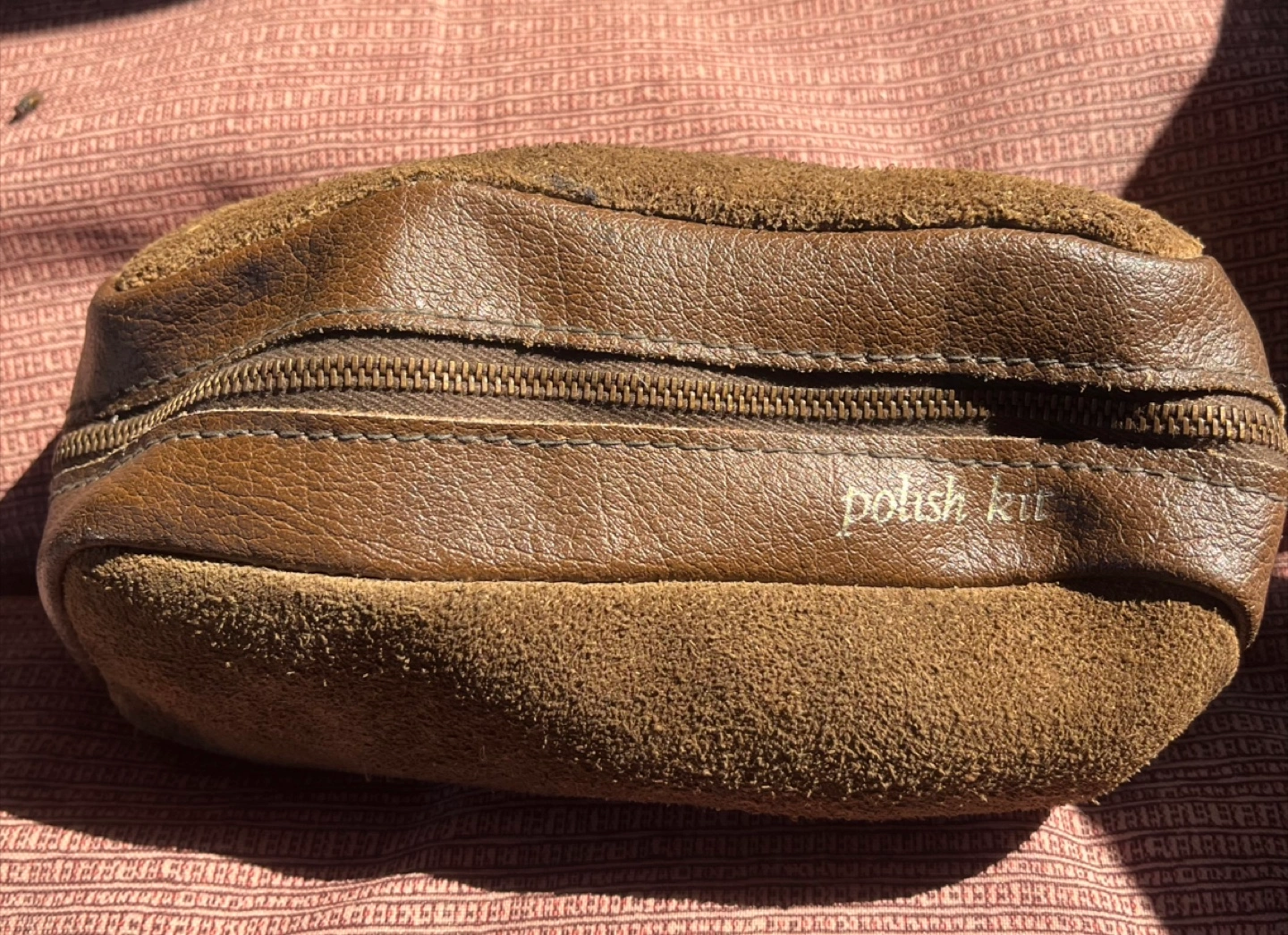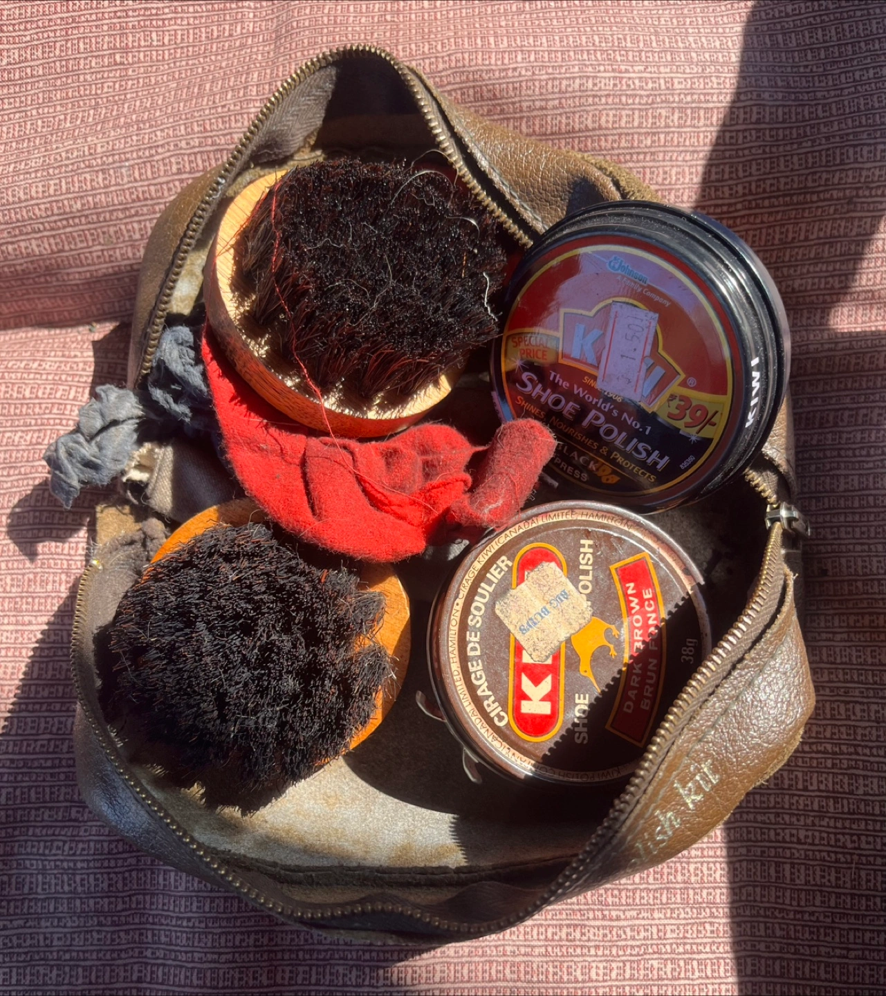Selling a vintage shoe polish kit. It includes brushes, cloths, and two tins of Kiwi shoe polish. The kit comes in a brown leather-like case with a zipper.