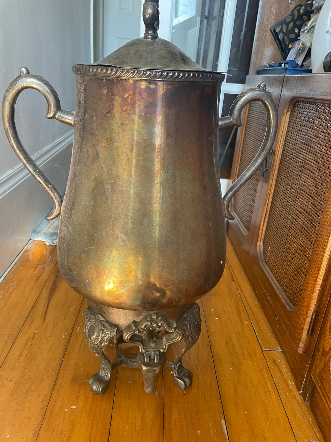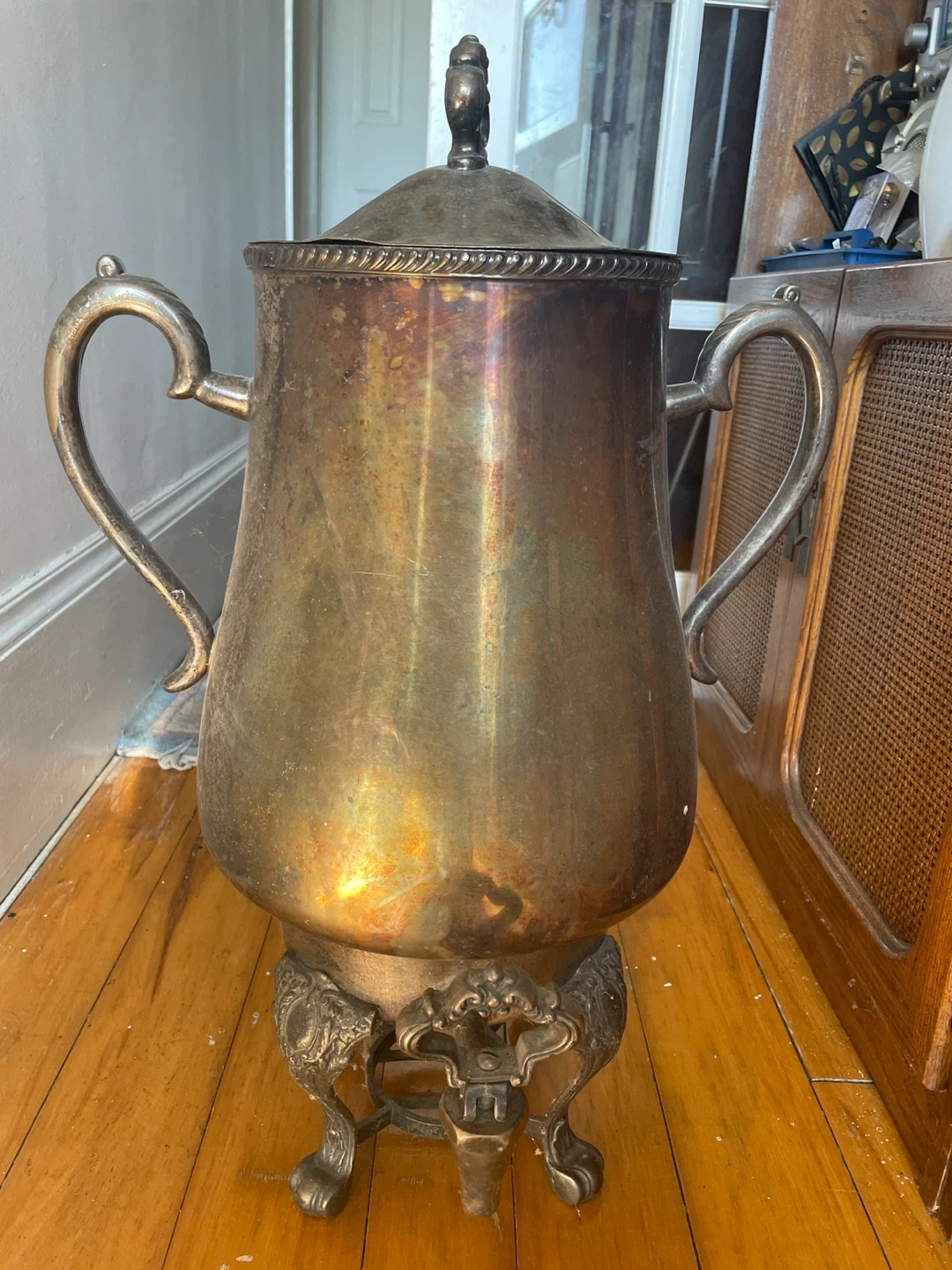 Selling a vintage silver plated coffee urn. It has a beautiful, classic design with ornate handles and a decorative base. There are some signs of wear and tarnish, which add to its vintage charm. Perfect for adding a touch of elegance to your home or for special occasions