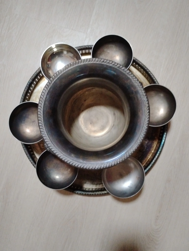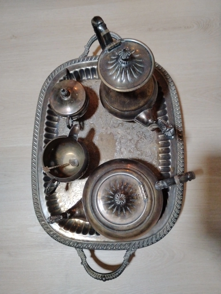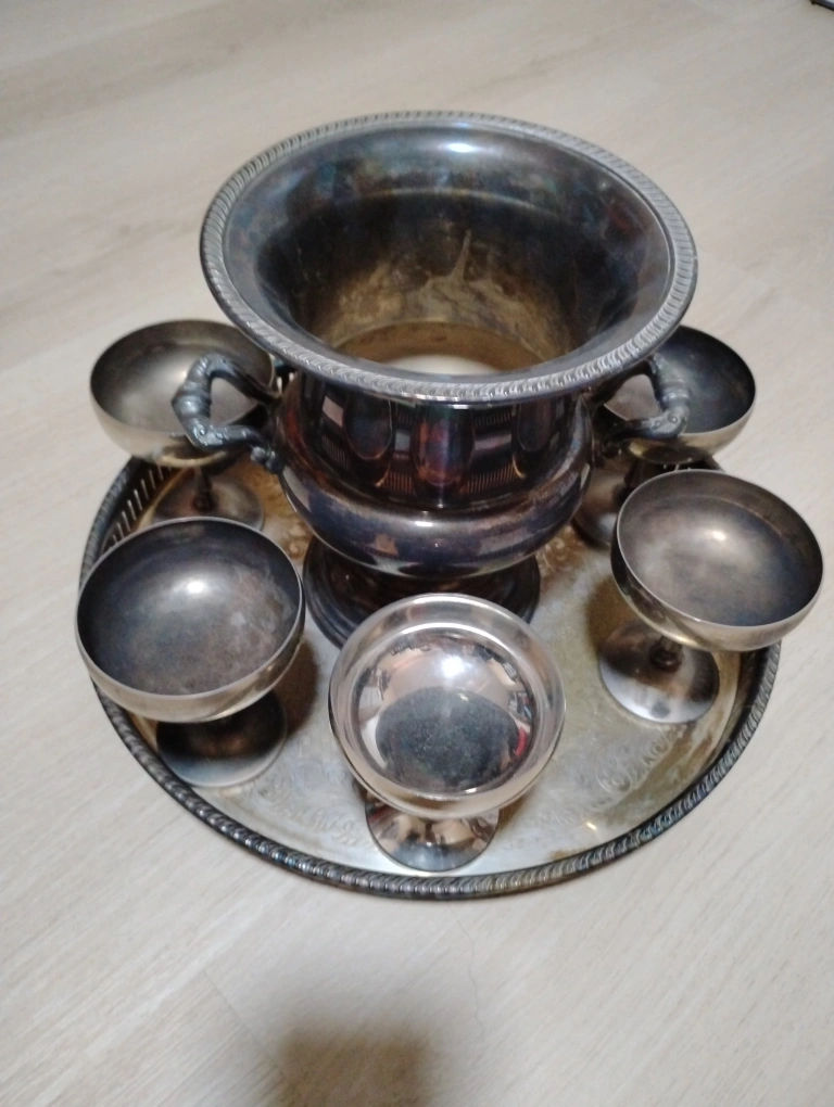 Selling a vintage silver plated tea/ coffee set. It includes a teapot, coffee pot, sugar bowl, creamer, and tray. Perfect for adding a touch of elegance to your tea time! Vintage Champagne glasses with ice bucket and tray set. Vintage / antique " Ianthe" Ian Heath Ltd silver plated candelabra. Firm $100 for everything.