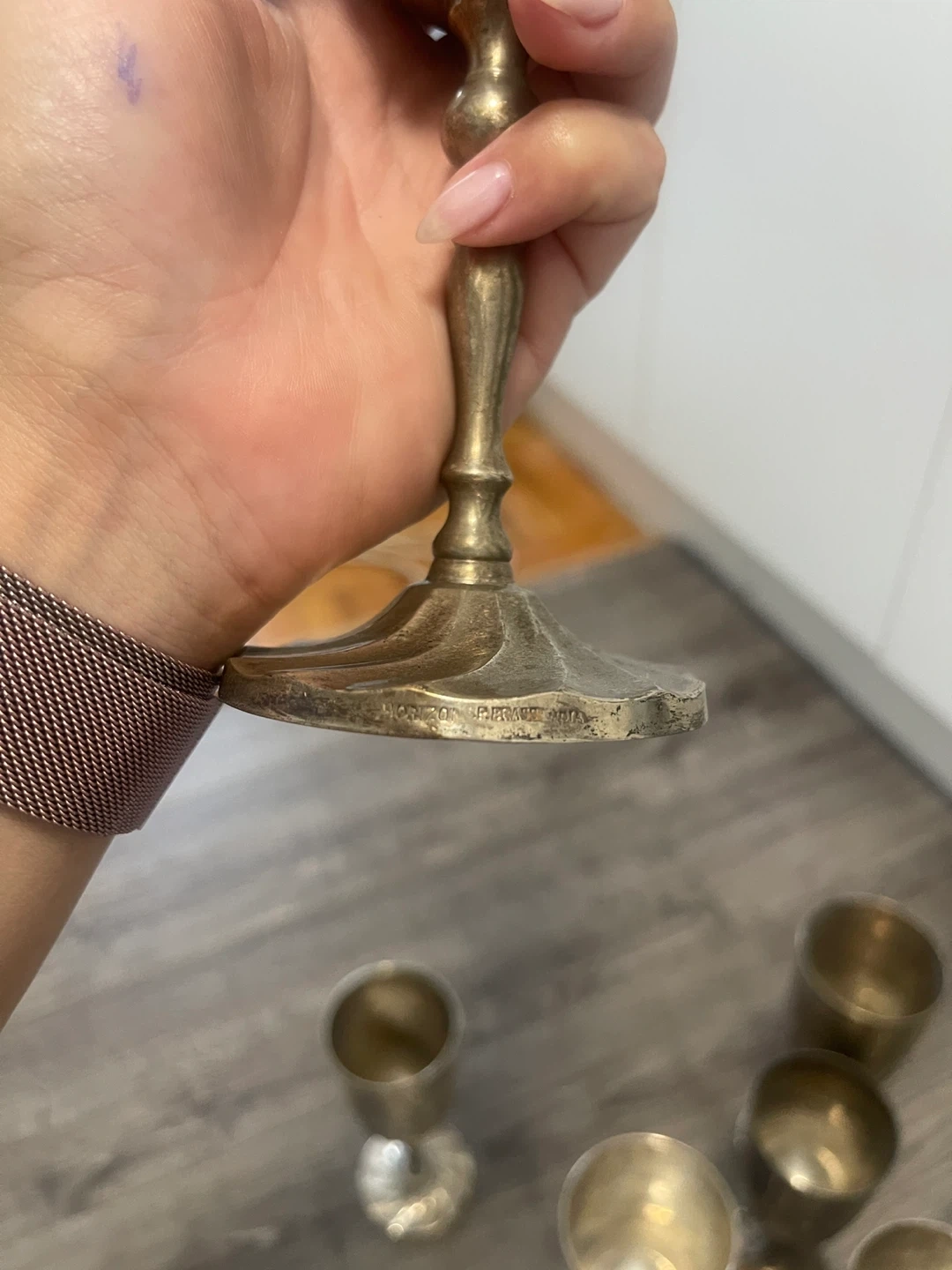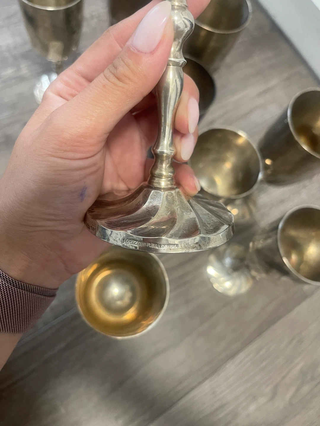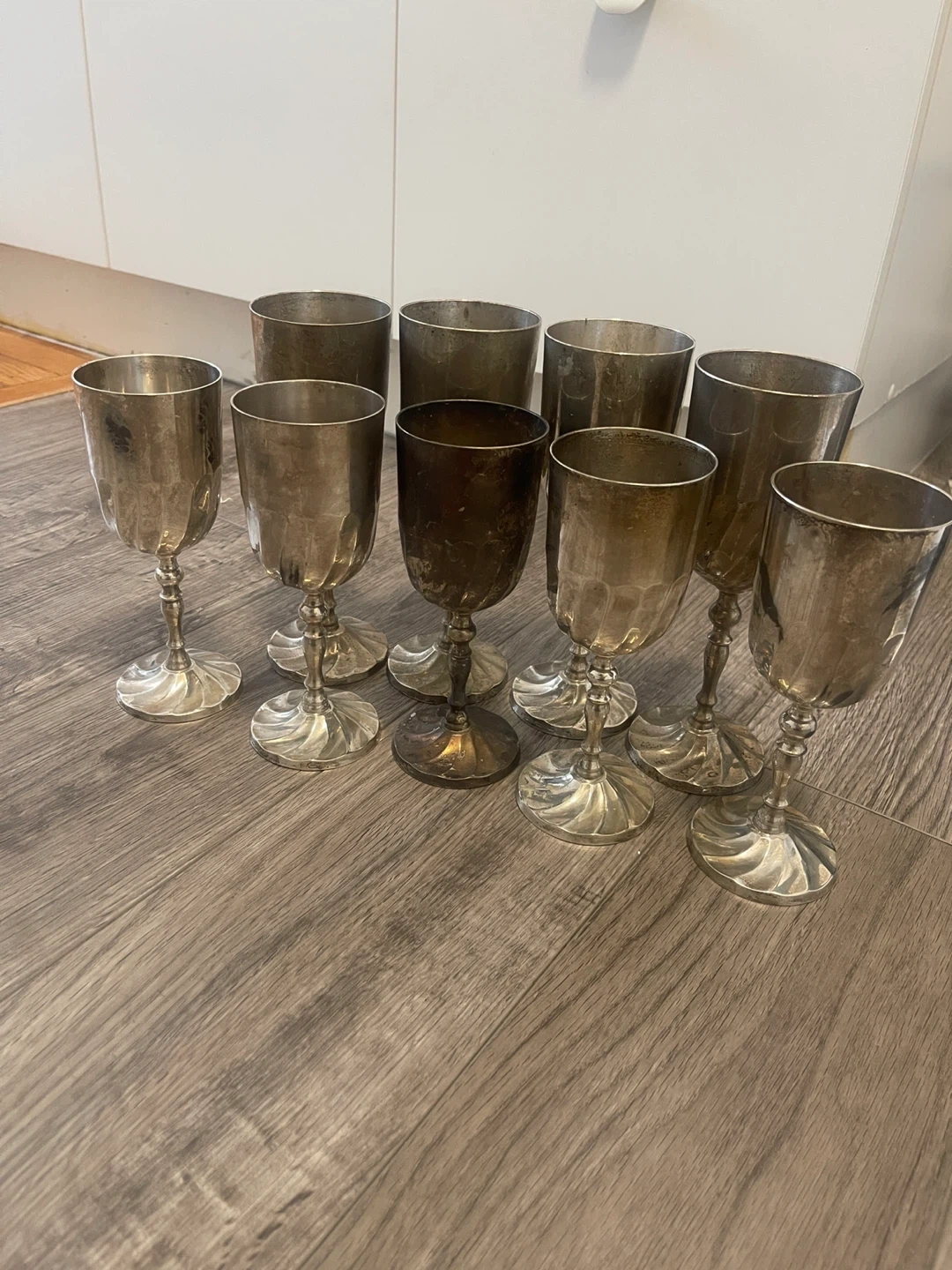 Selling a set of 9 vintage silver-plated wine goblets! They have some signs of wear, which adds to their vintage charm