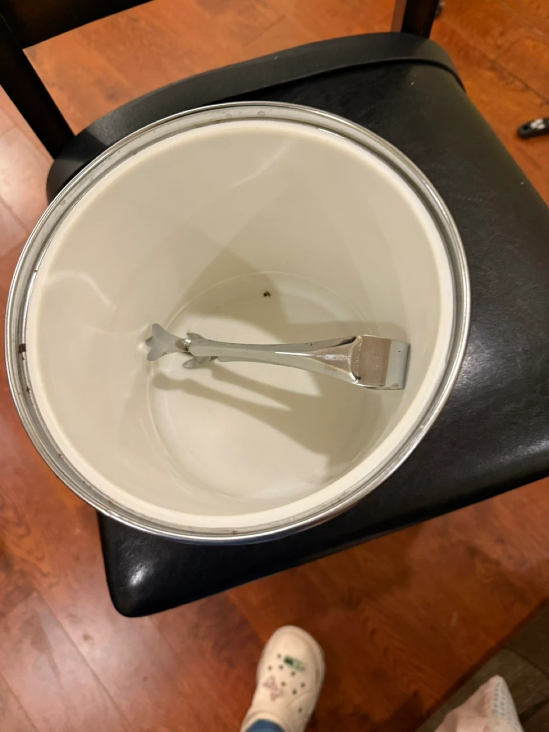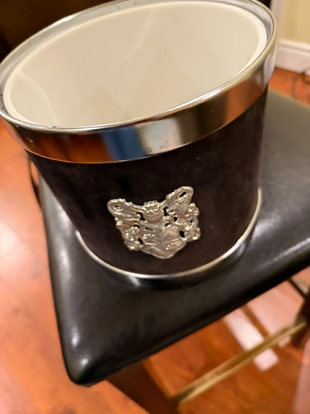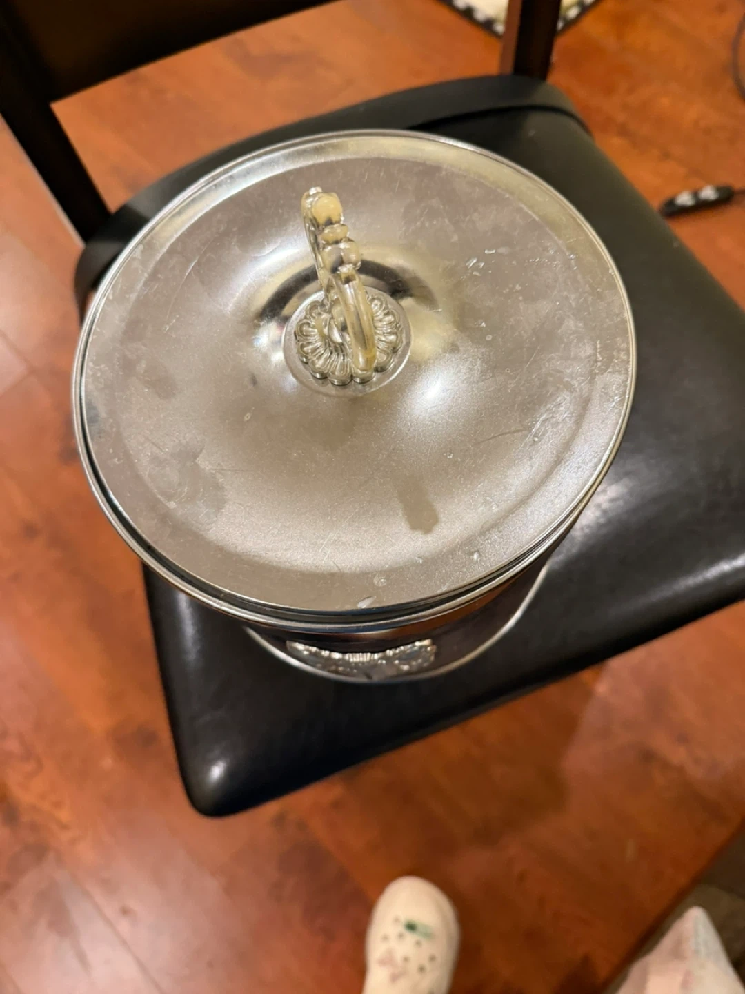 Selling a vintage silverplate ice bucket with a set of tongs. It features a decorative handle and an emblem on the side. Perfect for entertaining or adding a touch of elegance to your home bar!