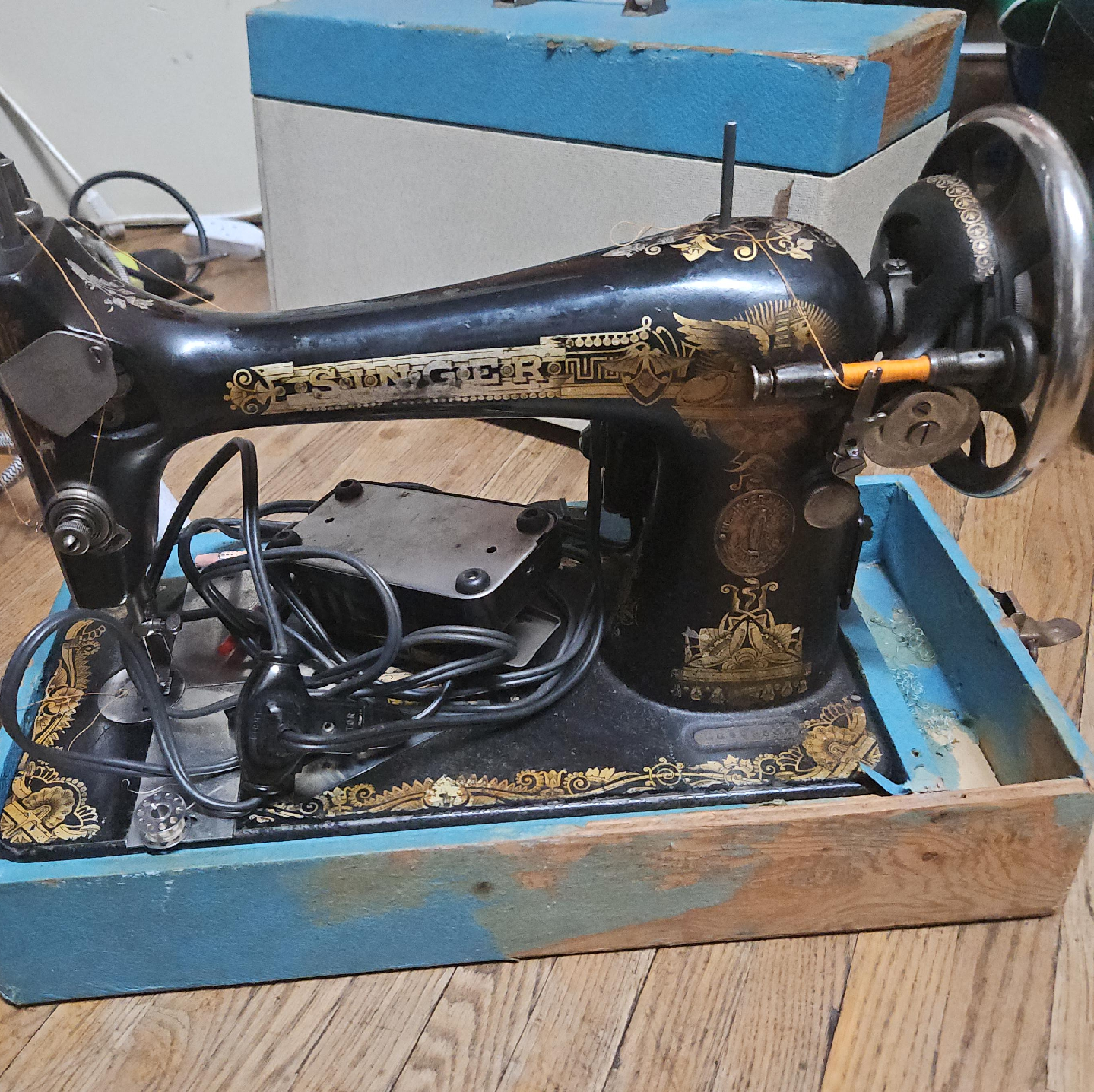 Selling a vintage Singer sewing machine! It has a beautiful black and gold design. Comes with its original case, which has some wear and tear from age. A really cool piece for collectors or anyone interested in vintage sewing machines
