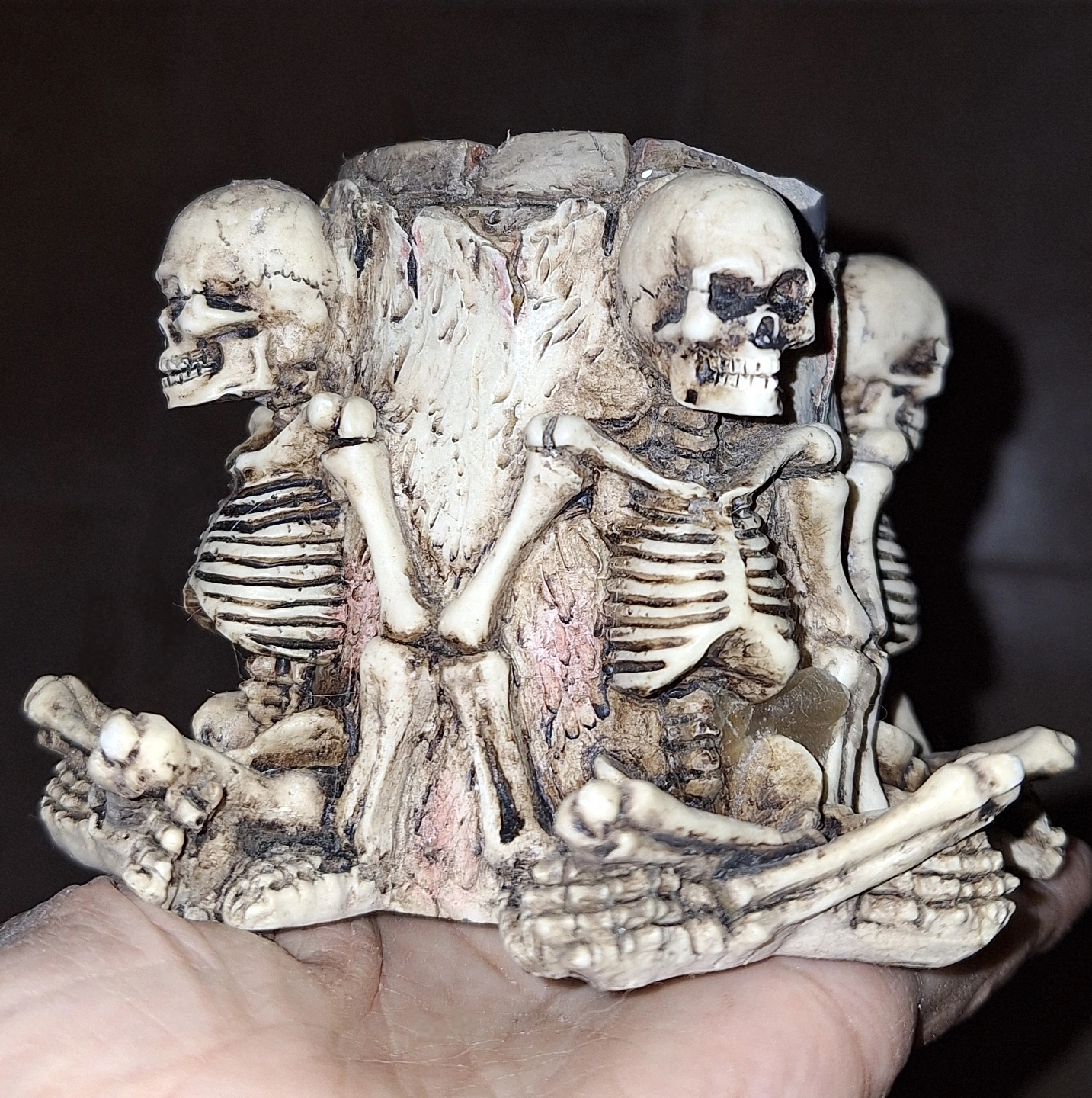 Here's a unique skeleton ceramic sculpture! It features skeletons sitting around a brick well, which holds a candle. Some damage. This spooky piece would be perfect for Halloween or any fan of the macabre. Made in 1999 Proceeds to cat rescue, Kit Cat Club Of Hamilton Upper Wentworth and Concession area Hamilton mountain