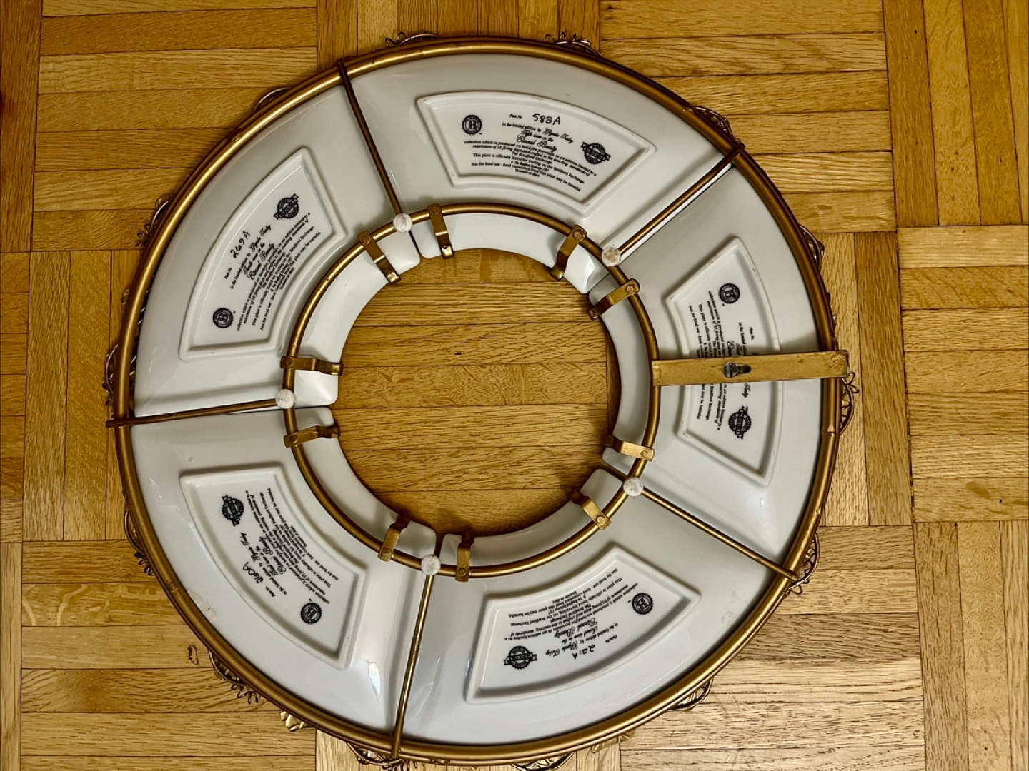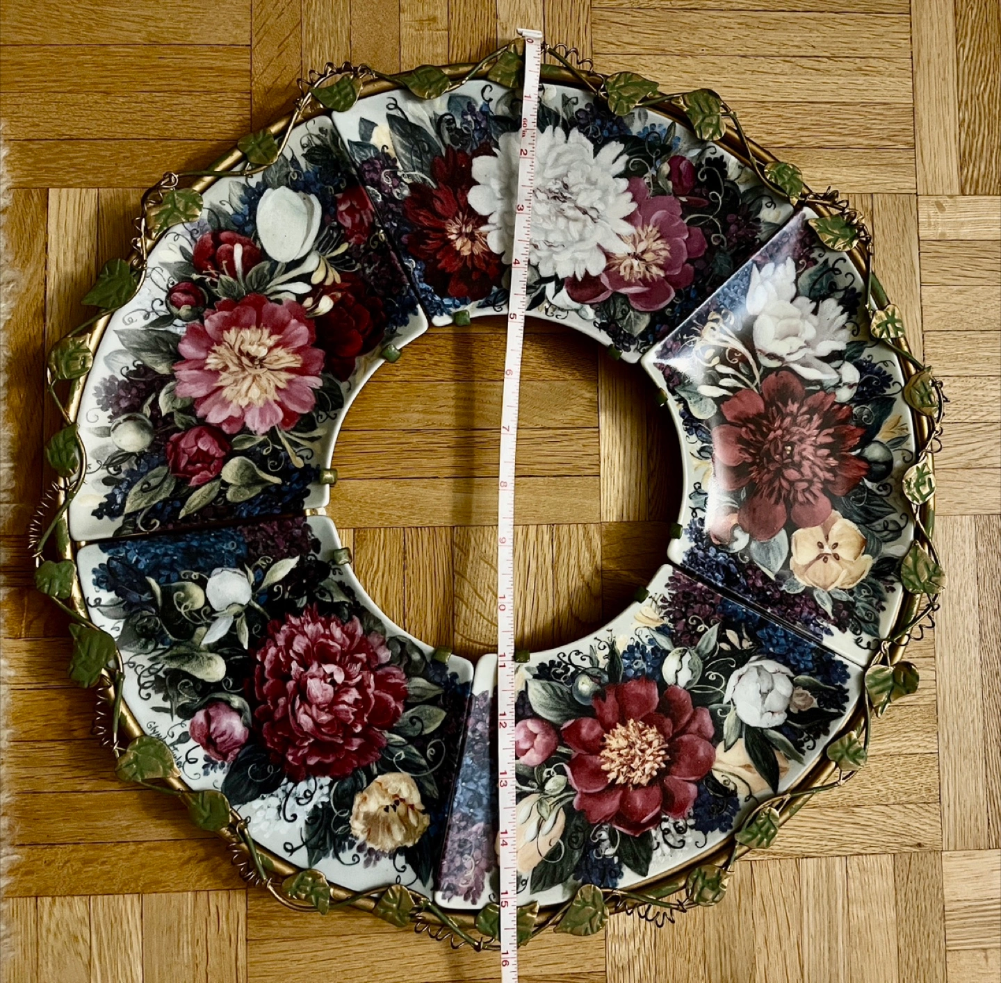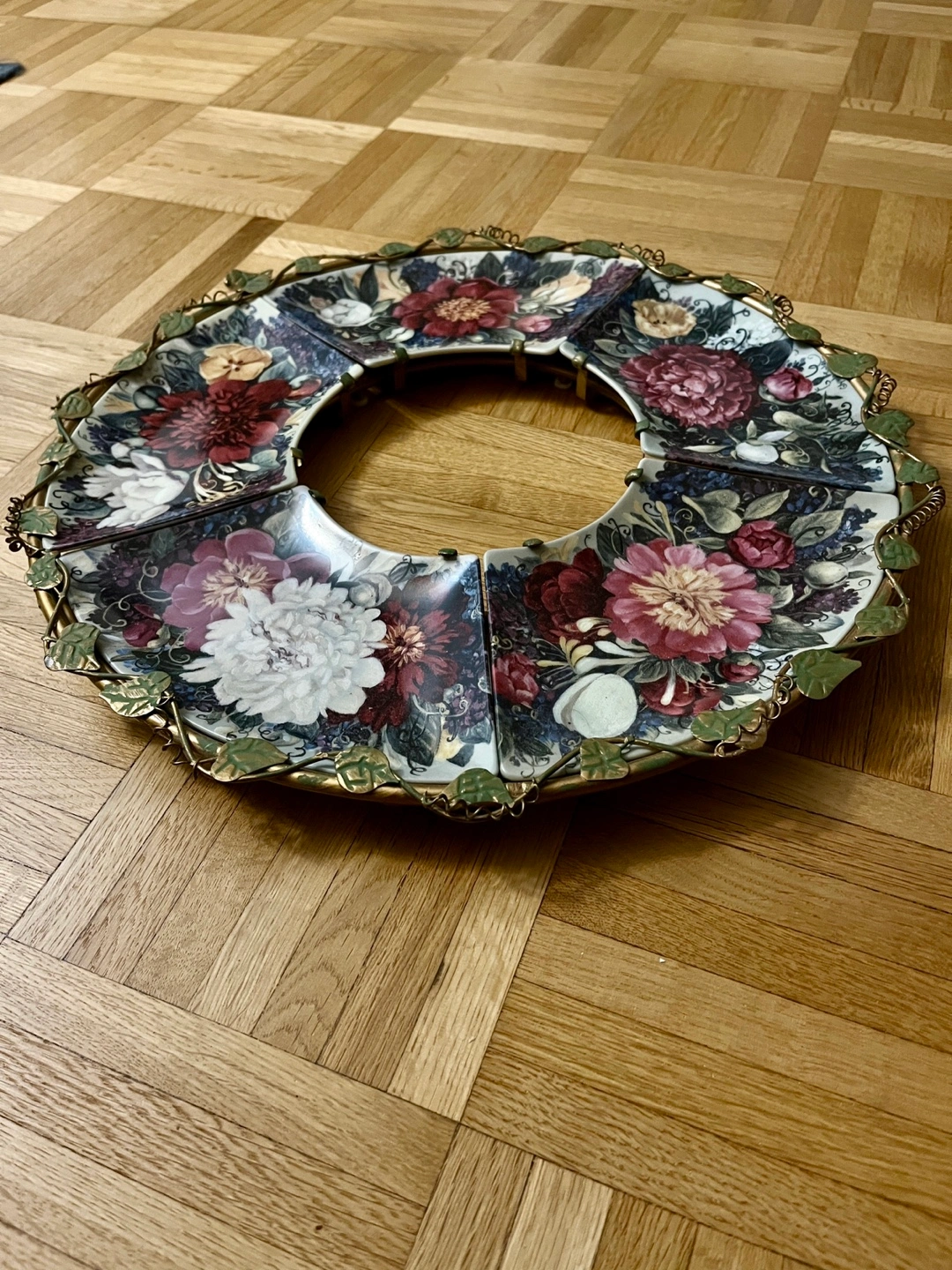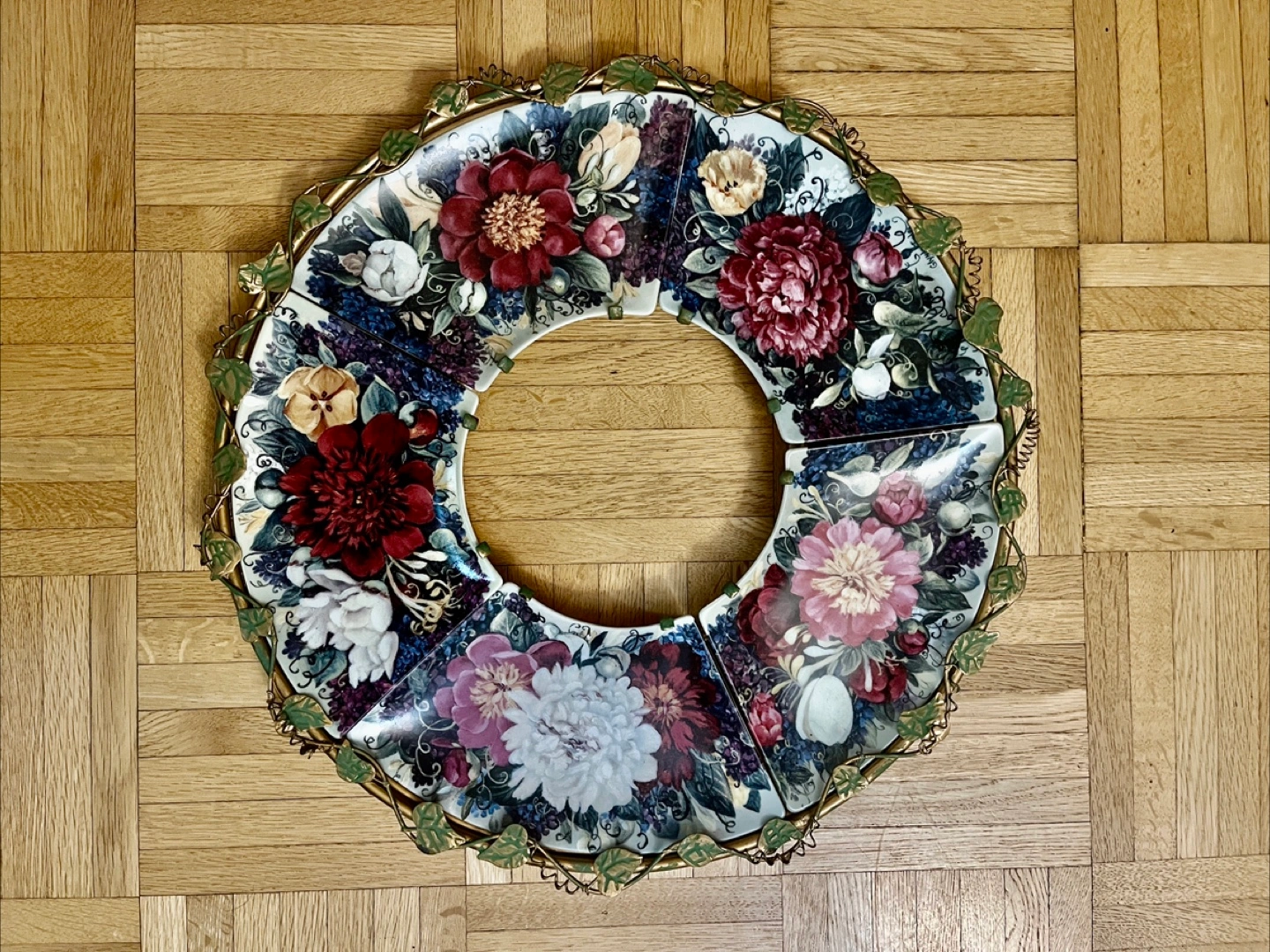 Selling a vintage So Rare China Lazy Susan. It features a beautiful floral design and a decorative gold-tone metal frame with leaf accents. It measures approximately 16 inches in diameter. A unique piece for your dining or serving needs!