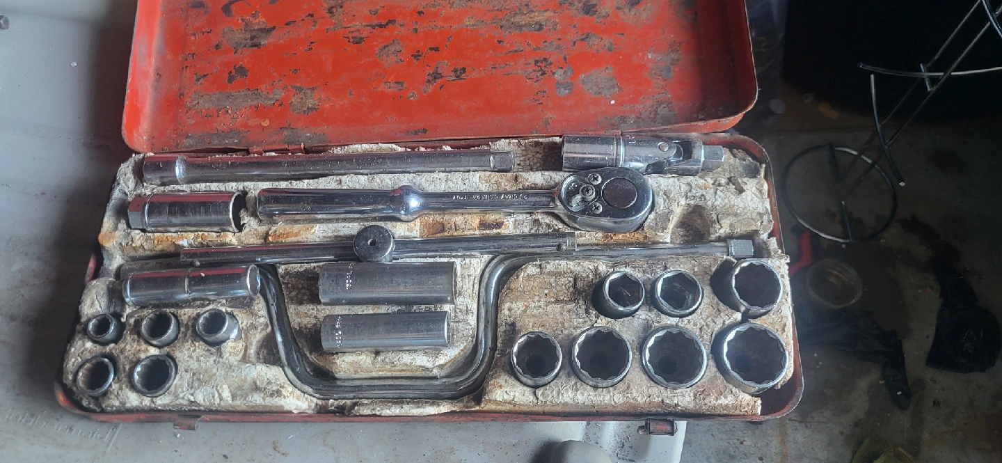 Selling a vintage socket wrench set that comes in a red metal case. The set includes various sockets, a ratchet, and extension bars. It looks like it's seen some use, but all the pieces are there!