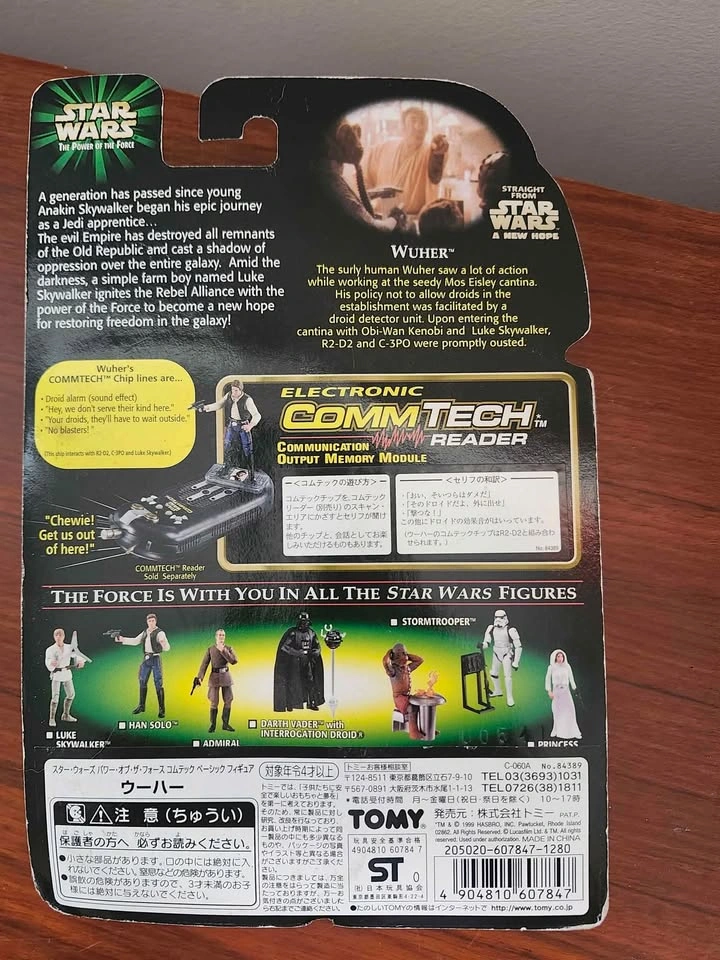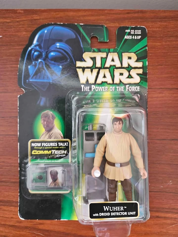 This Wuher with Droid Detector Unit Star Wars action figure from The Power of the Force line is new in its original packaging. It's a rare find for any Star Wars collector! With its CommTech chip, this figure can even 'talk' with a special reader!