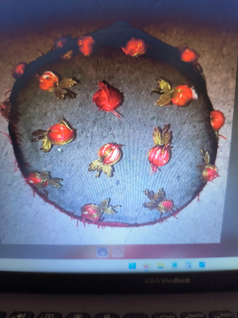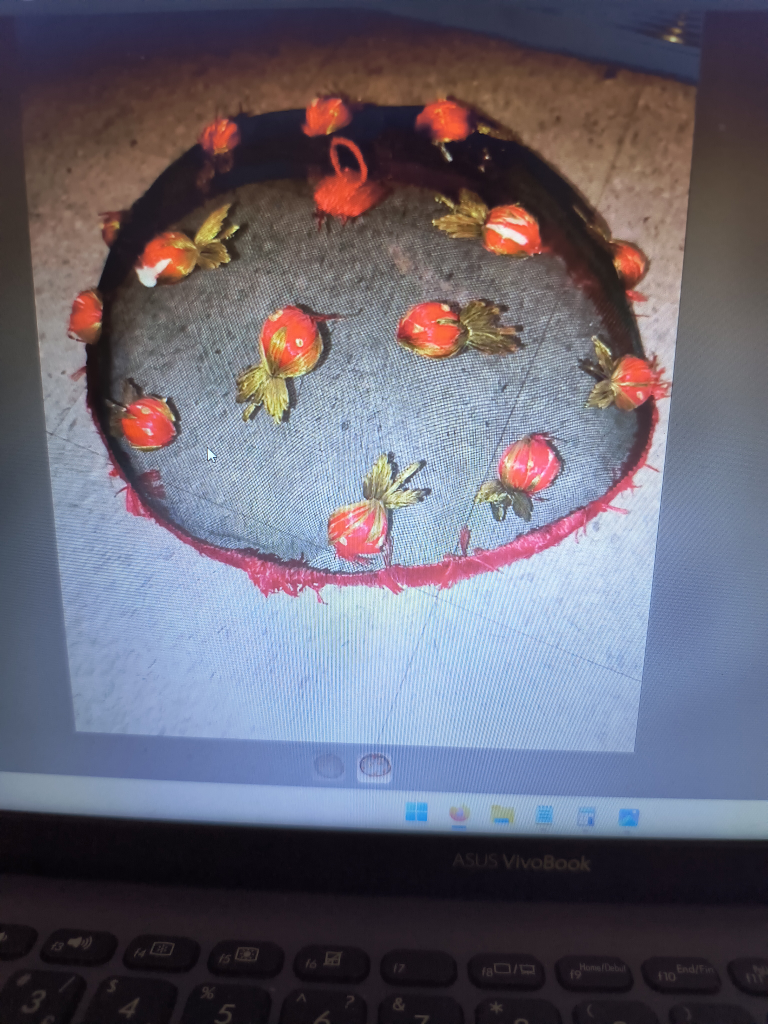 A vintage cake cover with a strawberry design. It has a netting top and a red fabric border. It is in the shape of a dome. There are 11 embroidered strawberries. The netting top has a small tear on one side. The fabric border is fraying. The cover has been pre-owned. LIMITED TIME ONLY 15%OFF