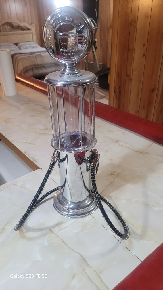 This is a really cool vintage-style liquor dispenser! It's made of plastic and has a clear container to see how much liquid is left. It would look great in a home bar or as a decorative piece
