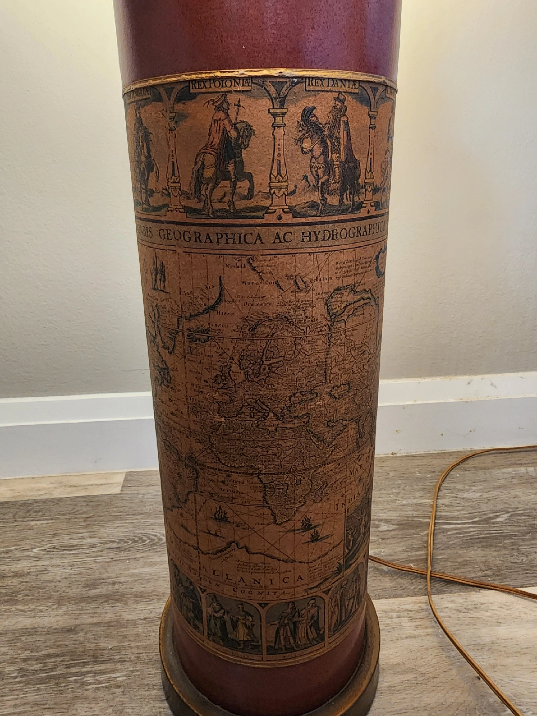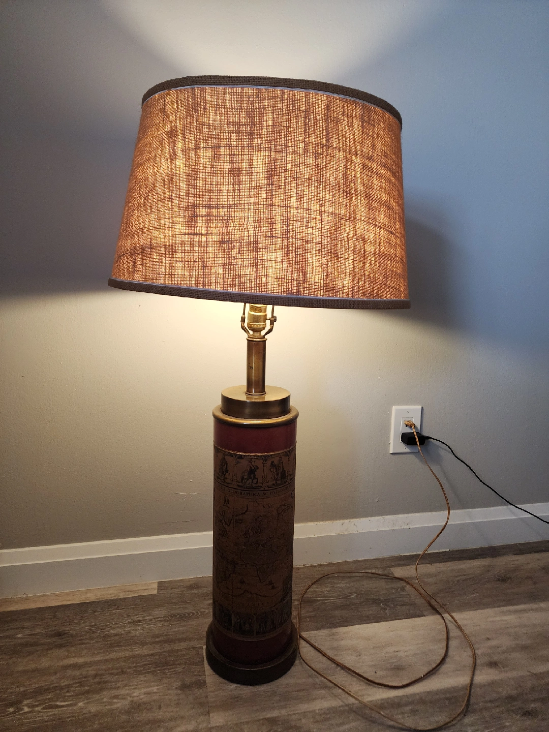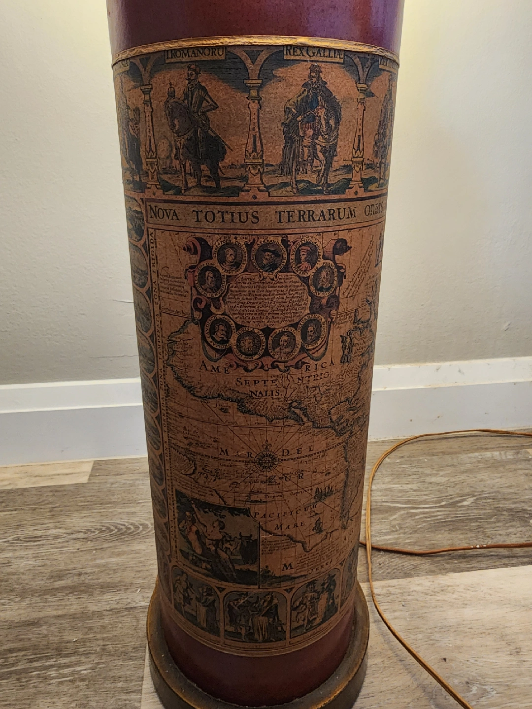 This is a vintage-style floor lamp with a map design around the base. It has a brown and gold colour scheme and would look great in any room! hight 95 centimeters pick up only near yong and Eglinton