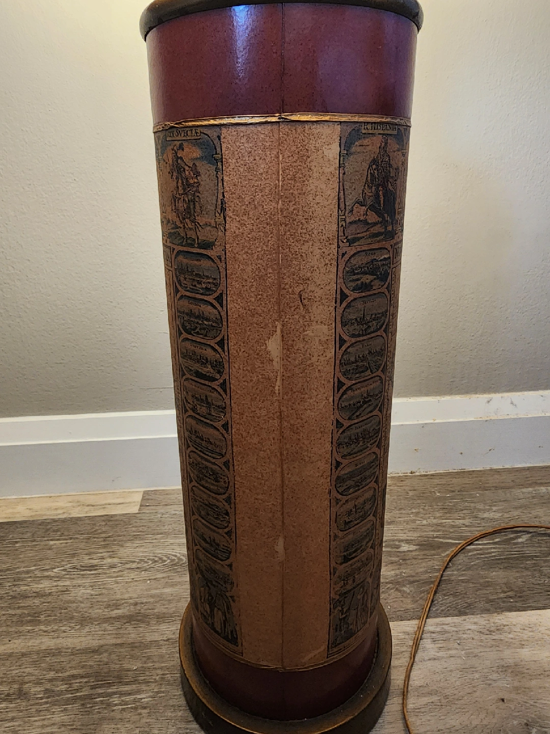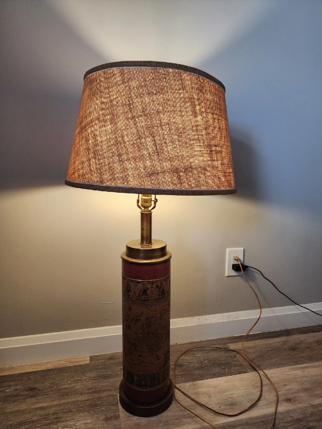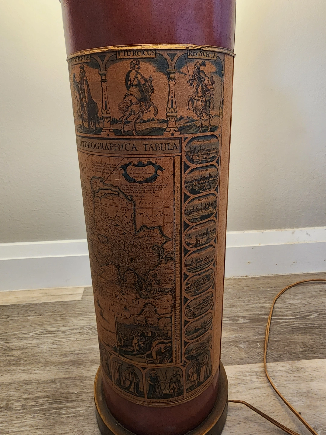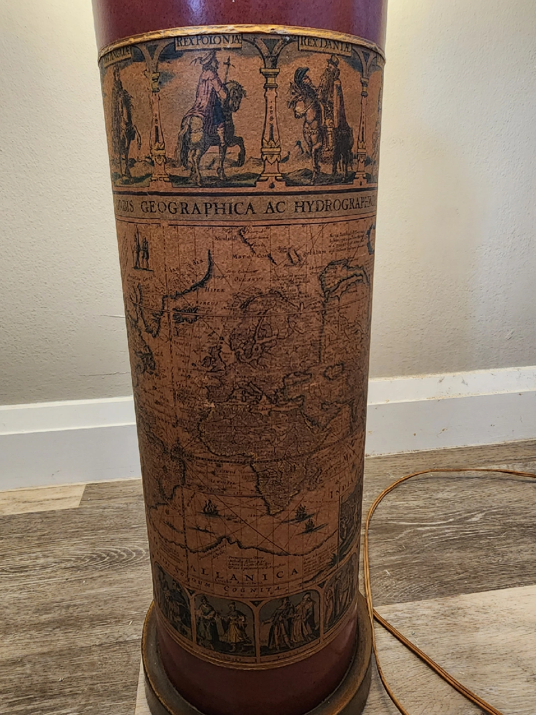 This is a vintage-style floor lamp with a map design around the base. It has a brown and gold colour scheme and would look great in any room! hight 95 centimeters pick up only near yong and Eglinton