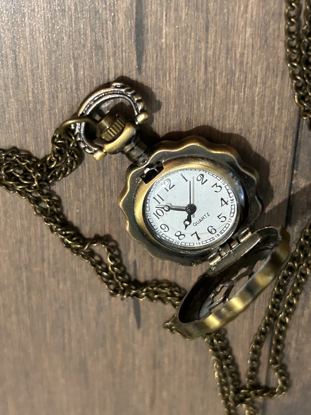 Selling a vintage-style pocket watch necklace! It features a unique design with a decorative floral pattern around the watch face. The chain is a matching antique bronze colour. The watch face is easy to read with clear numbers and a quartz movement