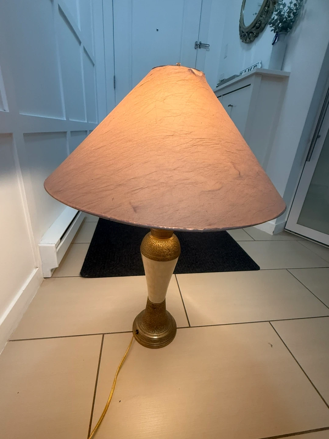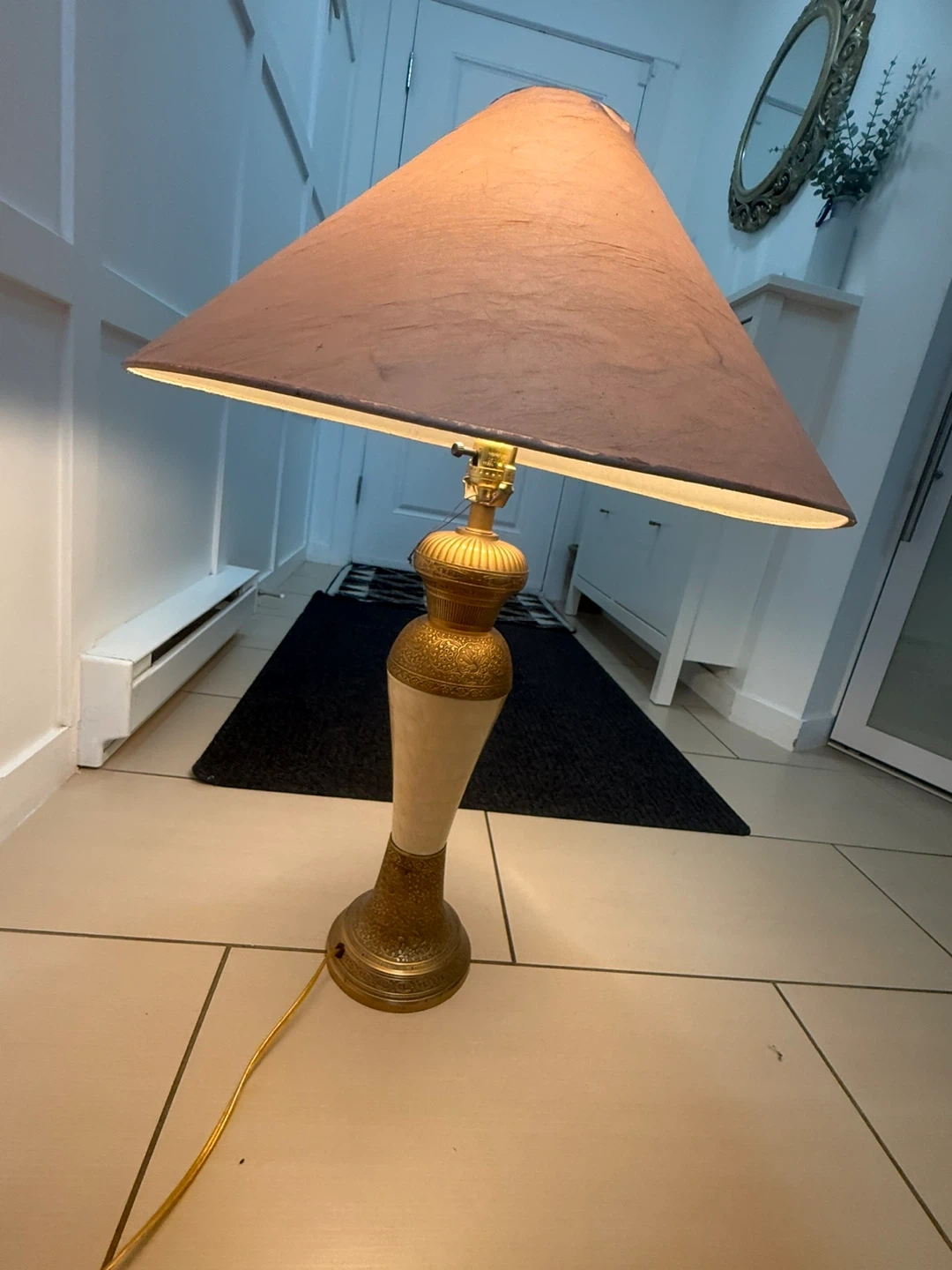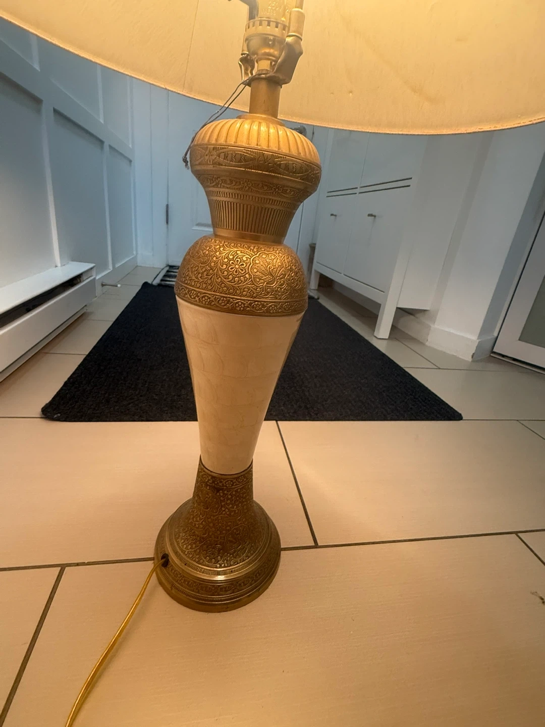 Selling a vintage-style table lamp. It features a unique design with a patterned base and a neutral-toned lampshade. This lamp would be a lovely addition to any room, providing a warm and inviting glow