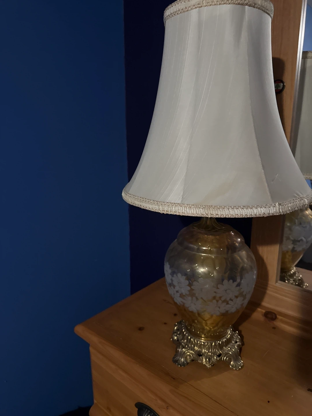Here's a lovely vintage-style table lamp that would look great in any room! It features a decorative gold-tone base with a delicate floral pattern and a classic white lampshade. It's in good condition and ready to brighten up your space