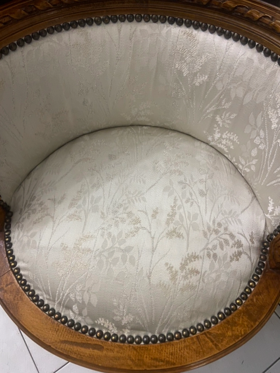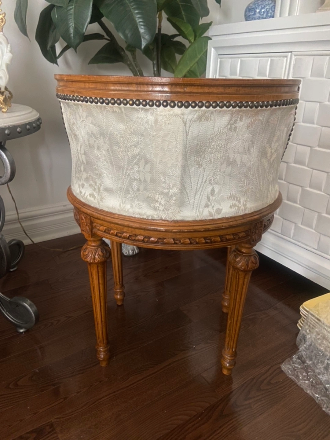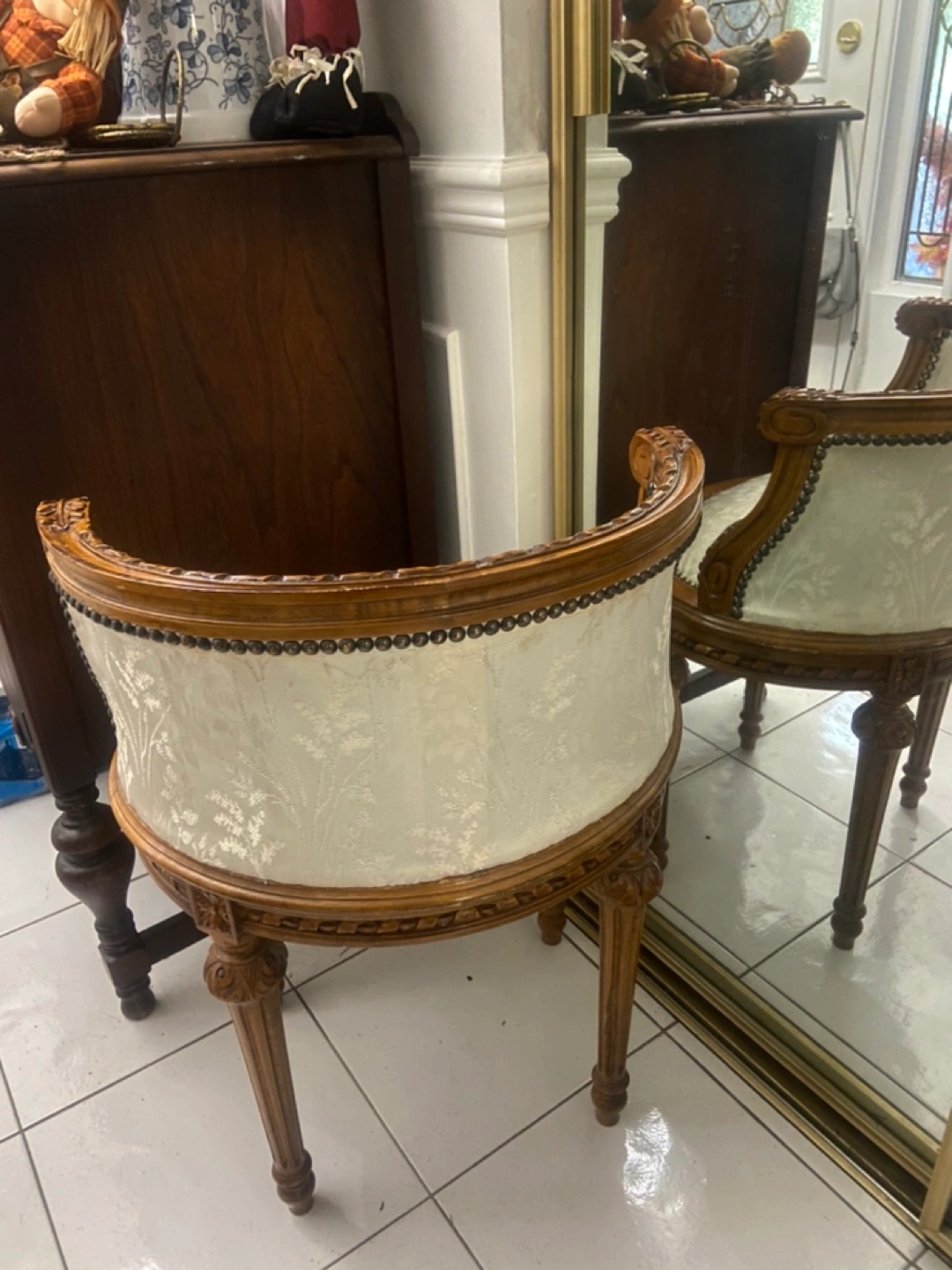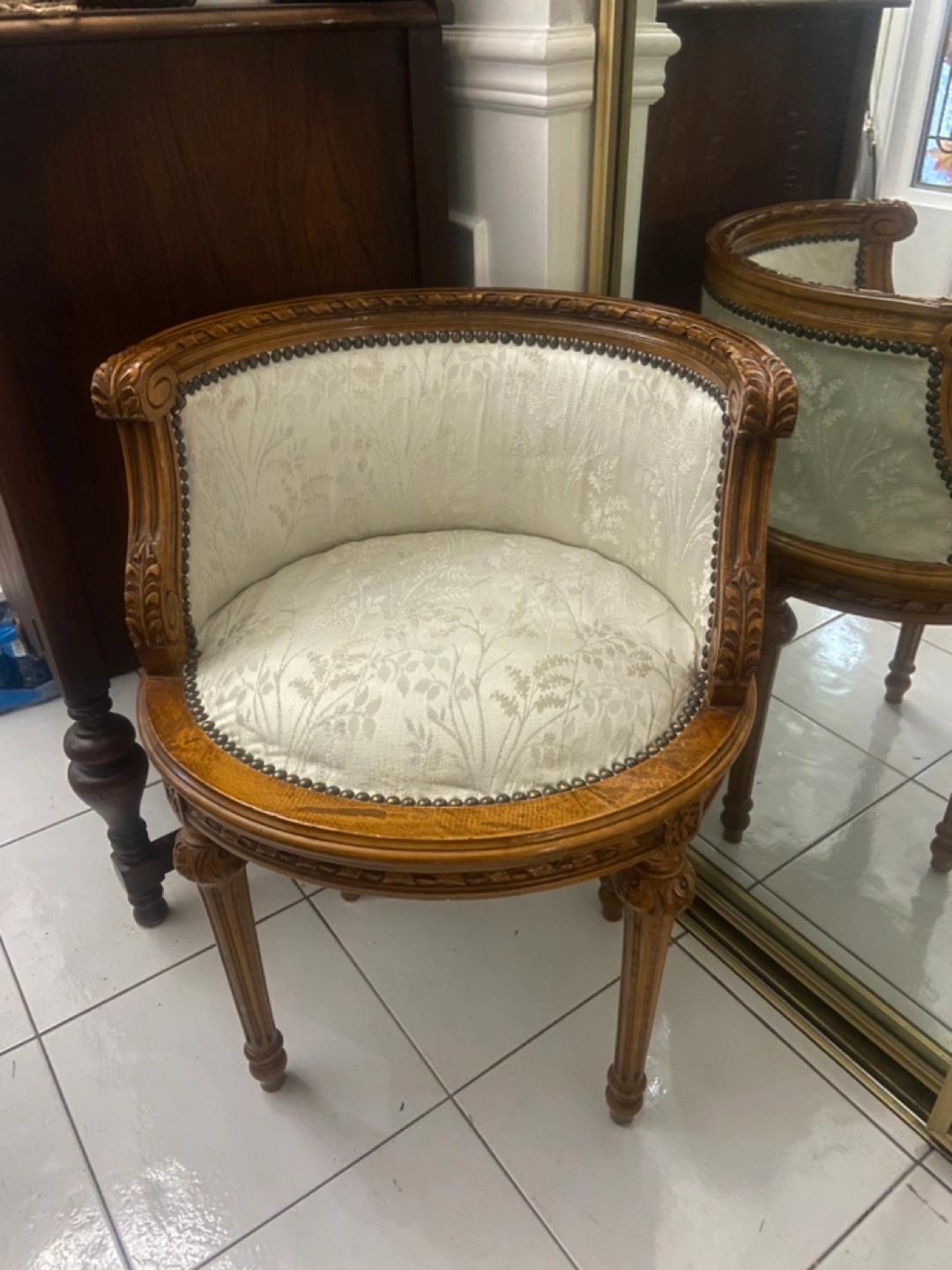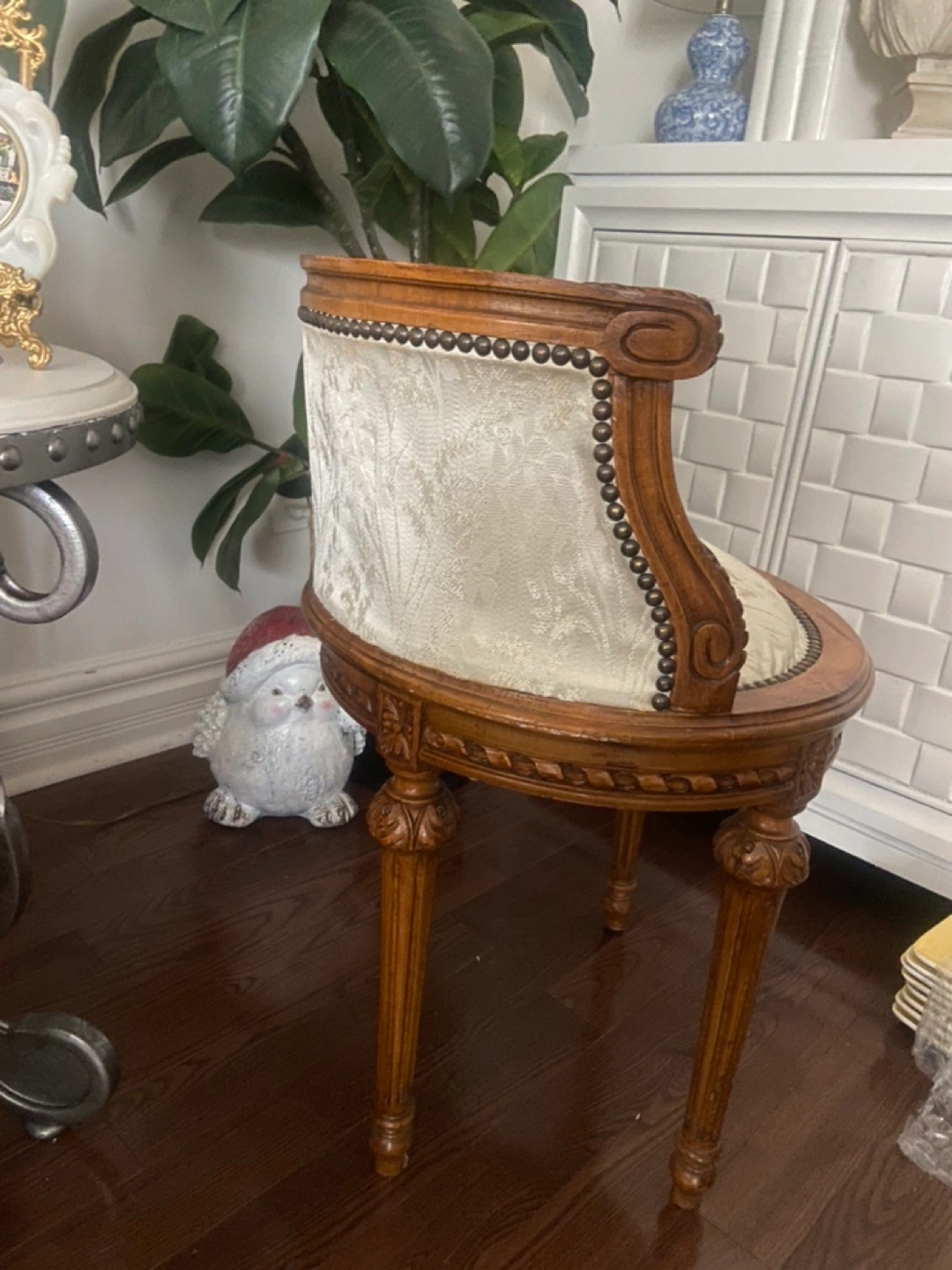 Selling a lovely vanity chair with an antique-style design. The chair features an ornate wood frame and a patterned white shadow print fabric seat. It would make a great addition to any bedroom or dressing area! Fill an empty corner with this beauty asking $100 or BO She’s waiting for a new home ! Smoke/Pet free home