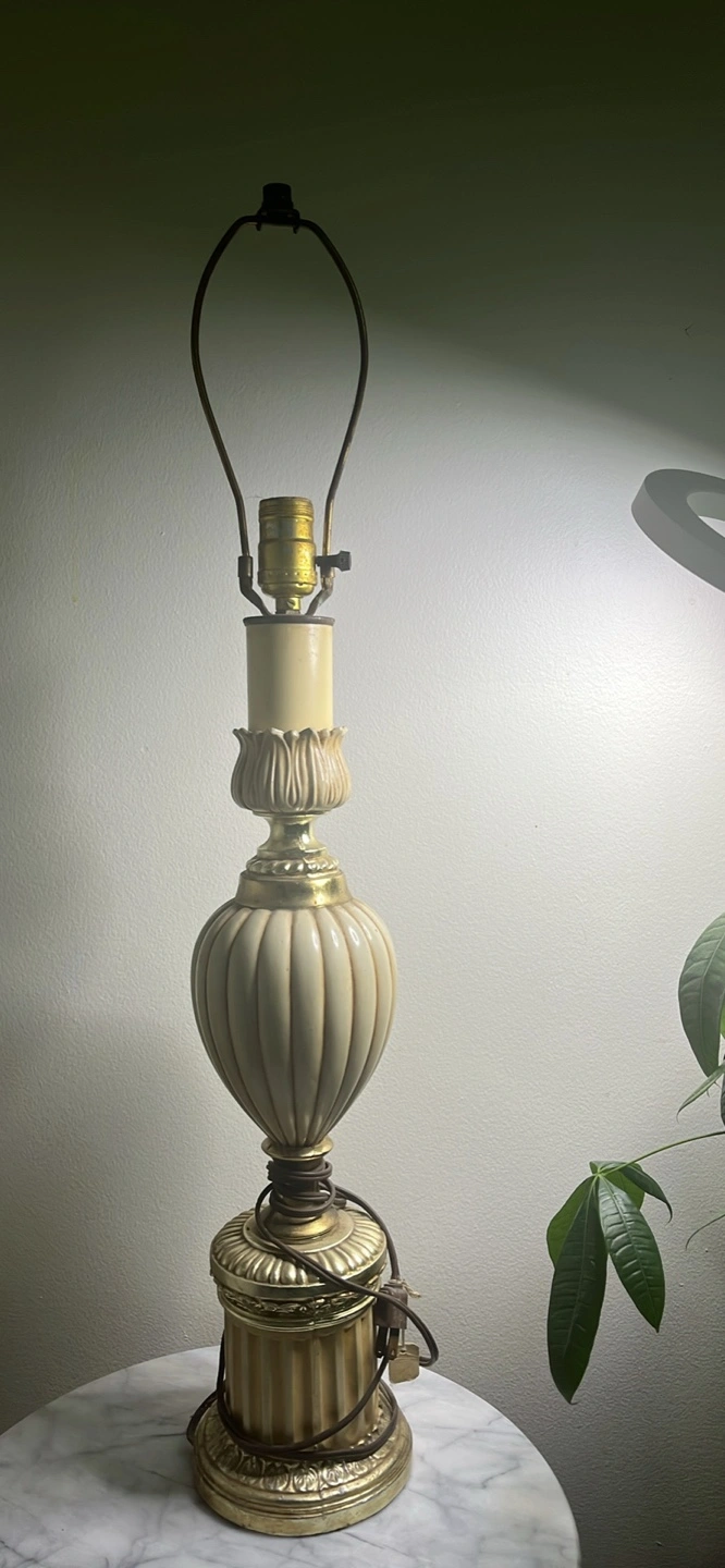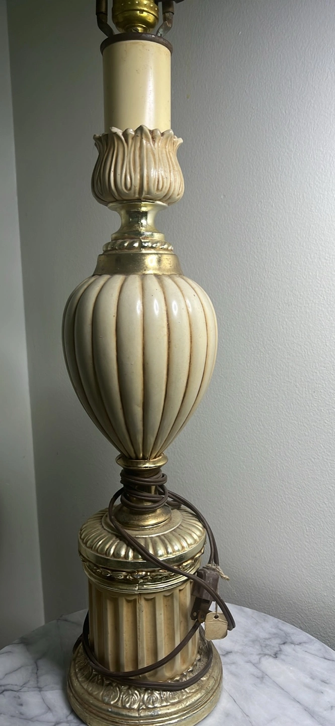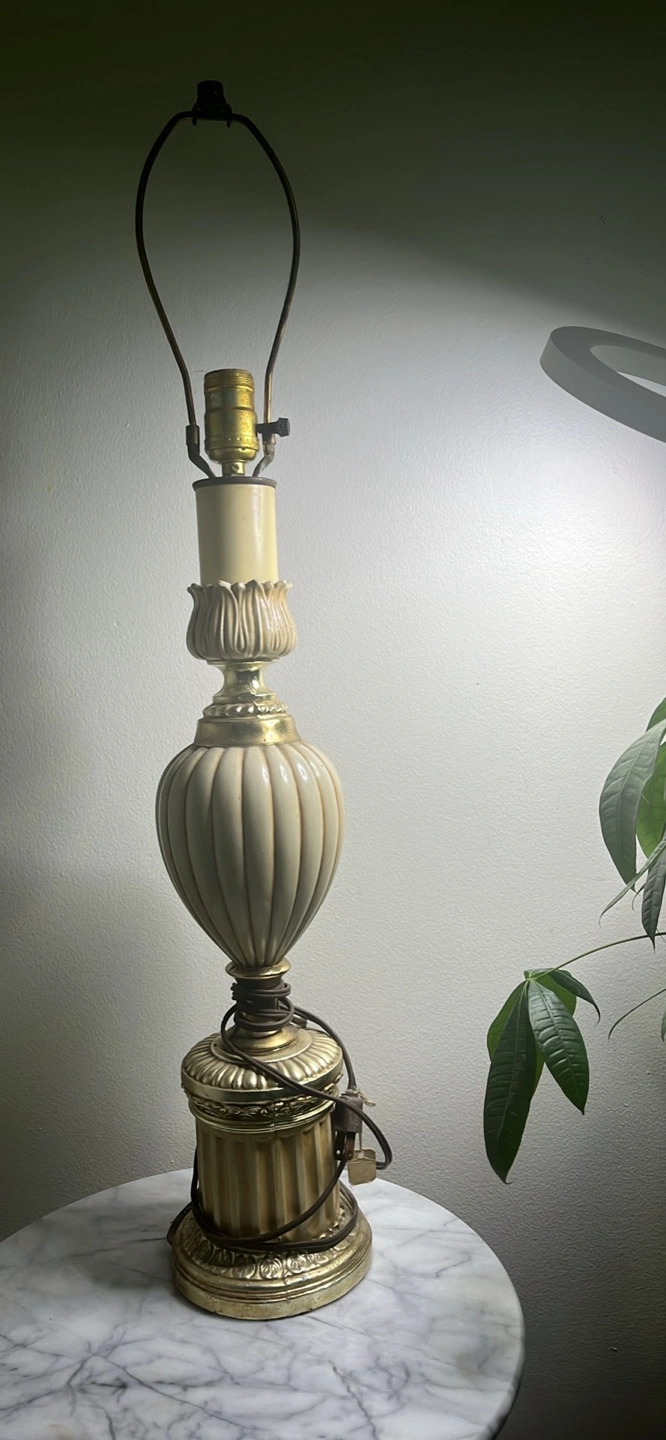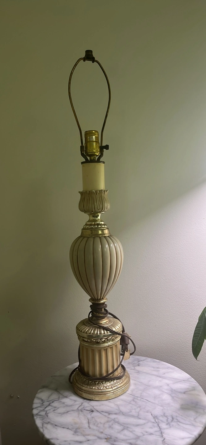 Beautiful antique table lamp. Gold coloured base and accents. Off-white fluted body. Classic design, great for a bedside table or living room. No shade. Smoke free home. Pick up only. 401 + Islington