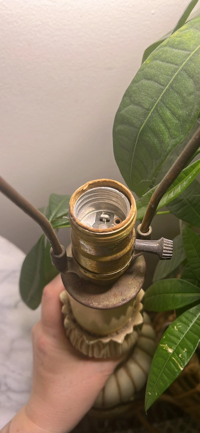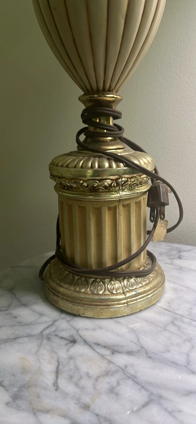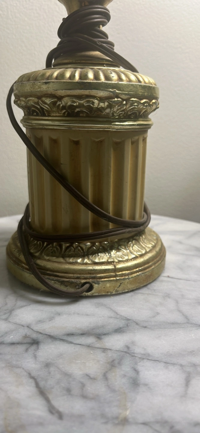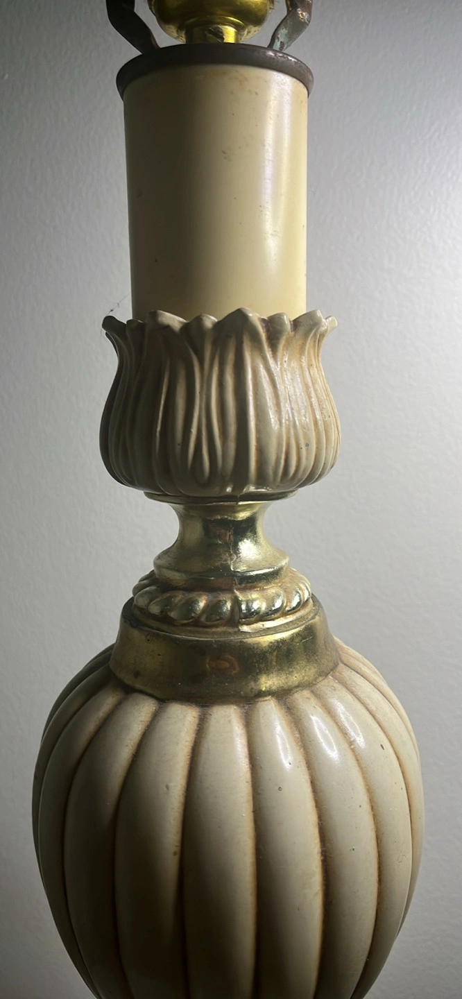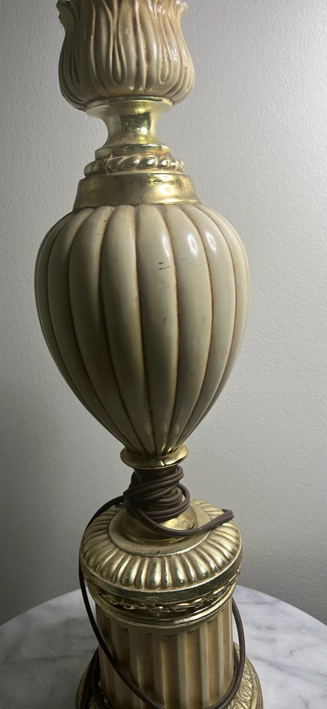 Beautiful antique table lamp. Gold coloured base and accents. Off-white fluted body. Classic design, great for a bedside table or living room. No shade. Smoke free home. Pick up only. 401 + Islington