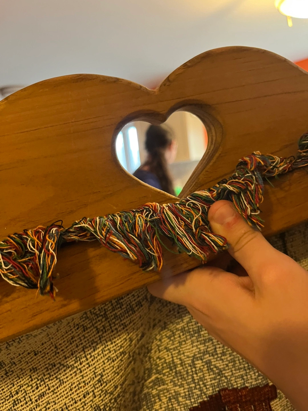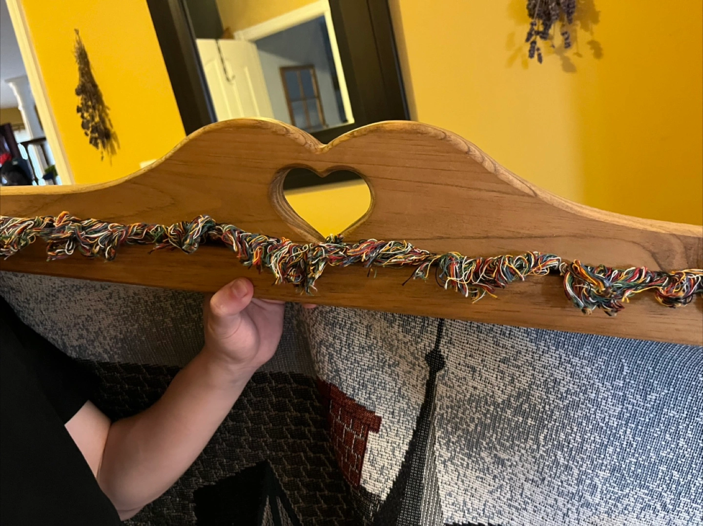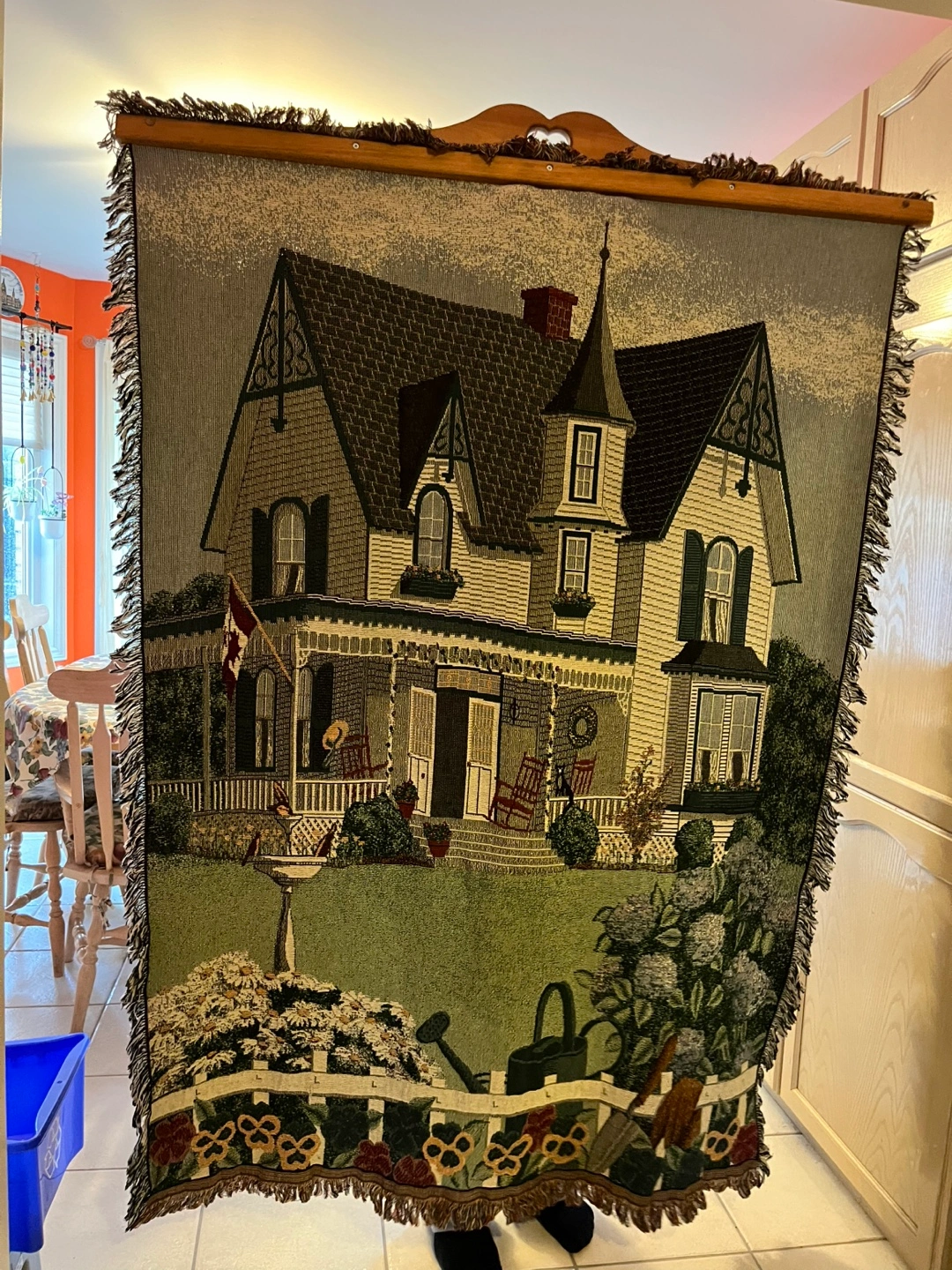 Beautiful vintage tapestry featuring a charming house scene. Wooden hanger with heart-shaped cutout. Fringed edges. Great addition to any home décor.