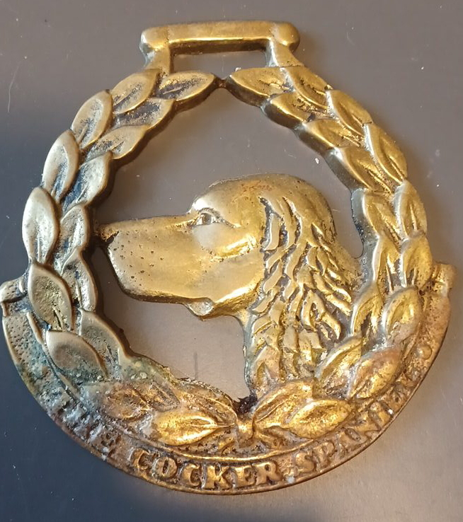 Selling a vintage horse brass featuring "The Cocker Spaniel" design. This unique piece would make a great addition to any collection or a charming decorative item for your home. It shows some signs of age, which adds to its character and vintage appeal
