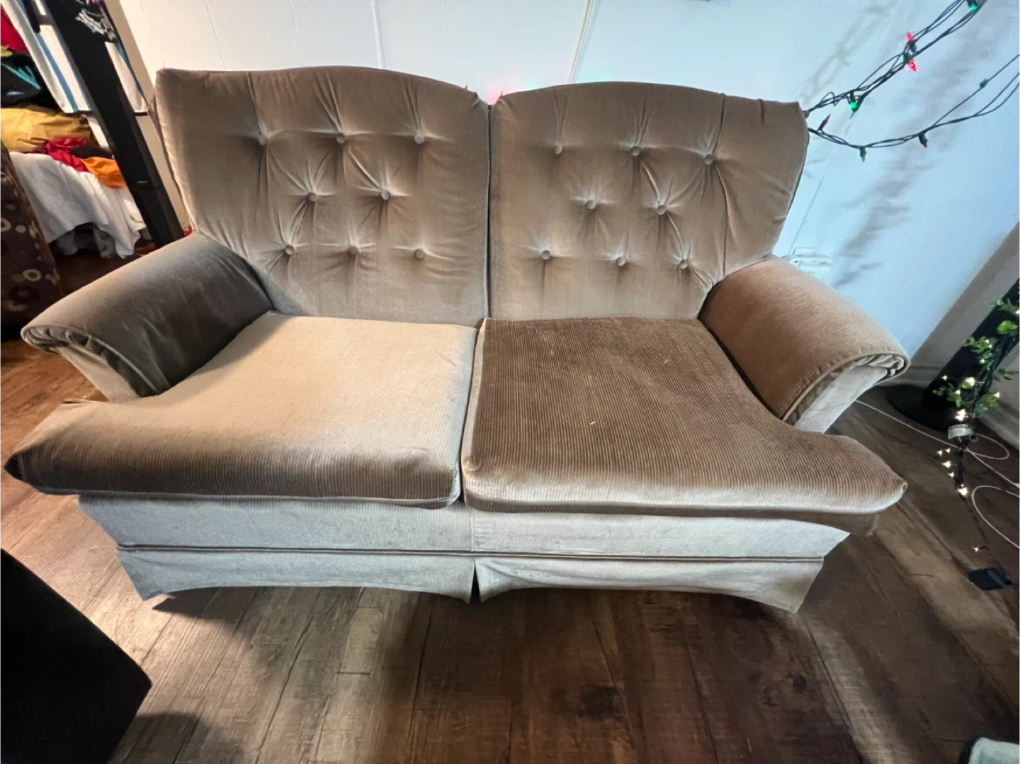 Selling a vintage tufted loveseat. It's a cozy beige colour and would look great in any living room or den. There are some signs of wear, as you can see in the photos, but it's still a comfortable and stylish piece of furniture