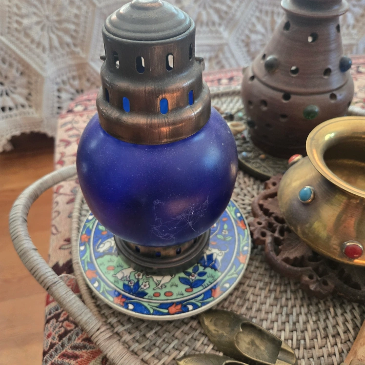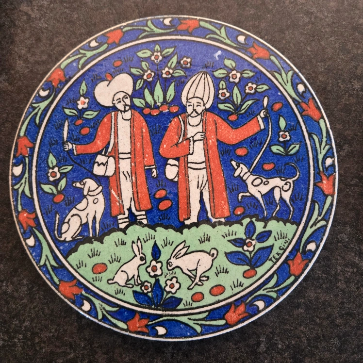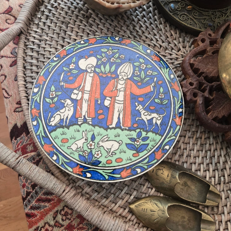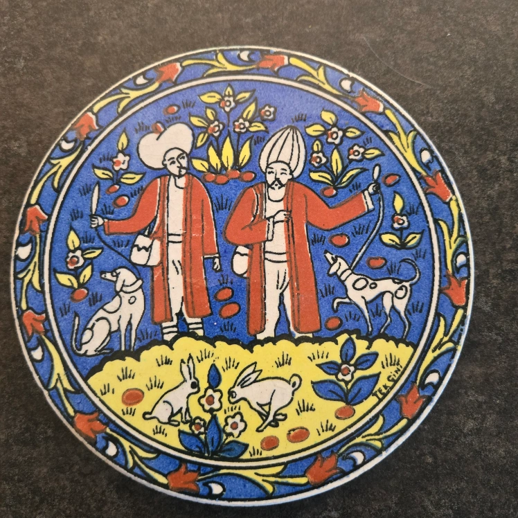 This is a decorative ceramic trivit, of Turkish origin, featuring a hand-painted design. The style is reminiscent of Iznik pottery, a type of decorated ceramic produced in Turkey from the 15th to the 17th century. $20/each or 2 for $35