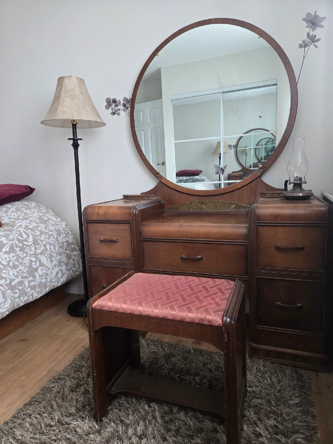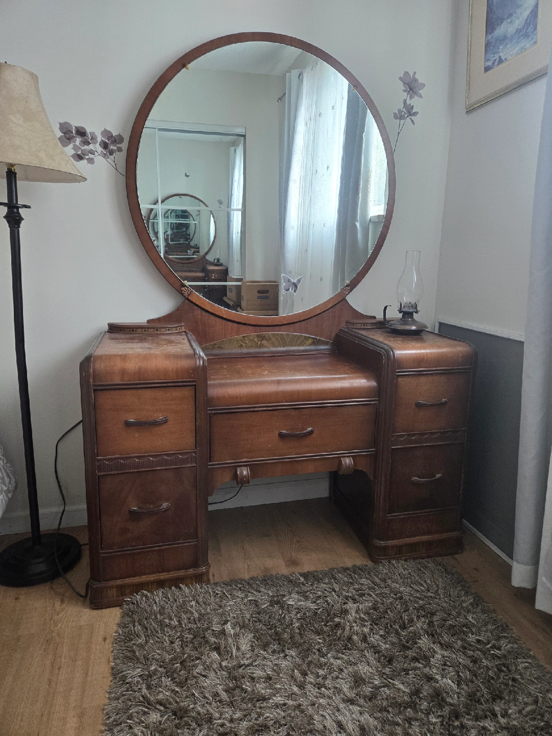 Selling a beautiful vintage vanity with a large circular mirror and matching stool. It features a classic design with multiple drawers for storage. The wood has a lovely warm tone, and the set would be a great addition to any bedroom or dressing area. There are some signs of wear and use, but it's still in good condition for its age