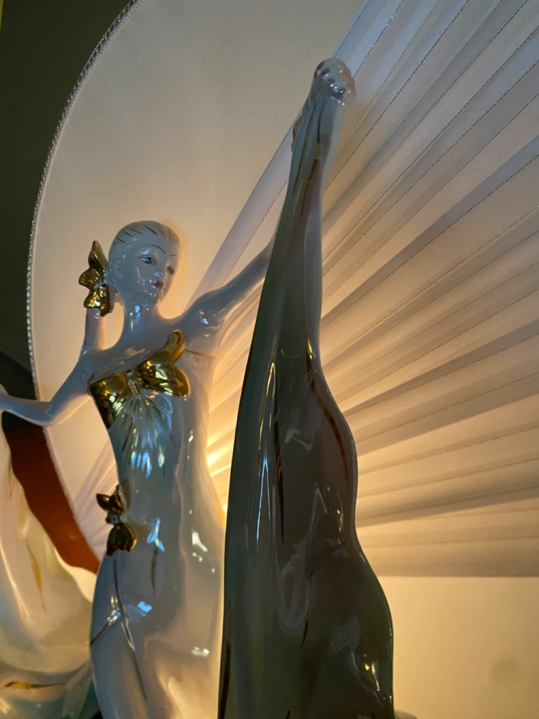 Beautiful vintage large figural lamps made by Versaces in Italy. The lamps features a woman ballerina figure with gold accents and a various color shading. They are truly stunning pieces created in the flamboyant Versace style. They will add elegance to any room. Extremely rare find from 1970s